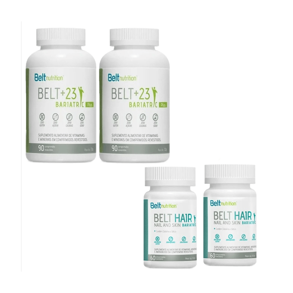 O Kit Belt +23 Bariatric Plus + Belt Hair Bariatric oferece suporte nutricional completo para quem realizou cirurgia bariátrica e deseja manter a saúde em dia, cuidando também de cabelos, unhas e pele. São 2 frascos de cada produto, garantindo mais praticidade e continuidade no seu cuidado diário.