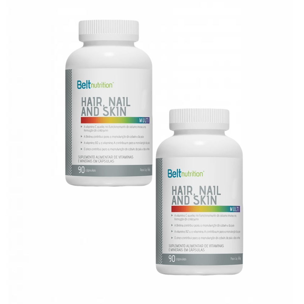 BELT HAIR, NAIL AND SKIN - TAMANHO FAMÍLIA. Kit contendo 2 frascos de 90 cápsulas cada.Chegou para facilitar os cuidados com os cabelos, a pele e as unhas. Junto com a biotina, estão presentes mais 16 vitaminas e minerais para potencializar o produto.Não contém glúten.Alérgicos: Contém derivados de soja.Atenção: Este produto não é um medicamento. Não exceder a recomendação diária do fabricante do produto. Sempre consumir com supervisão médica.
