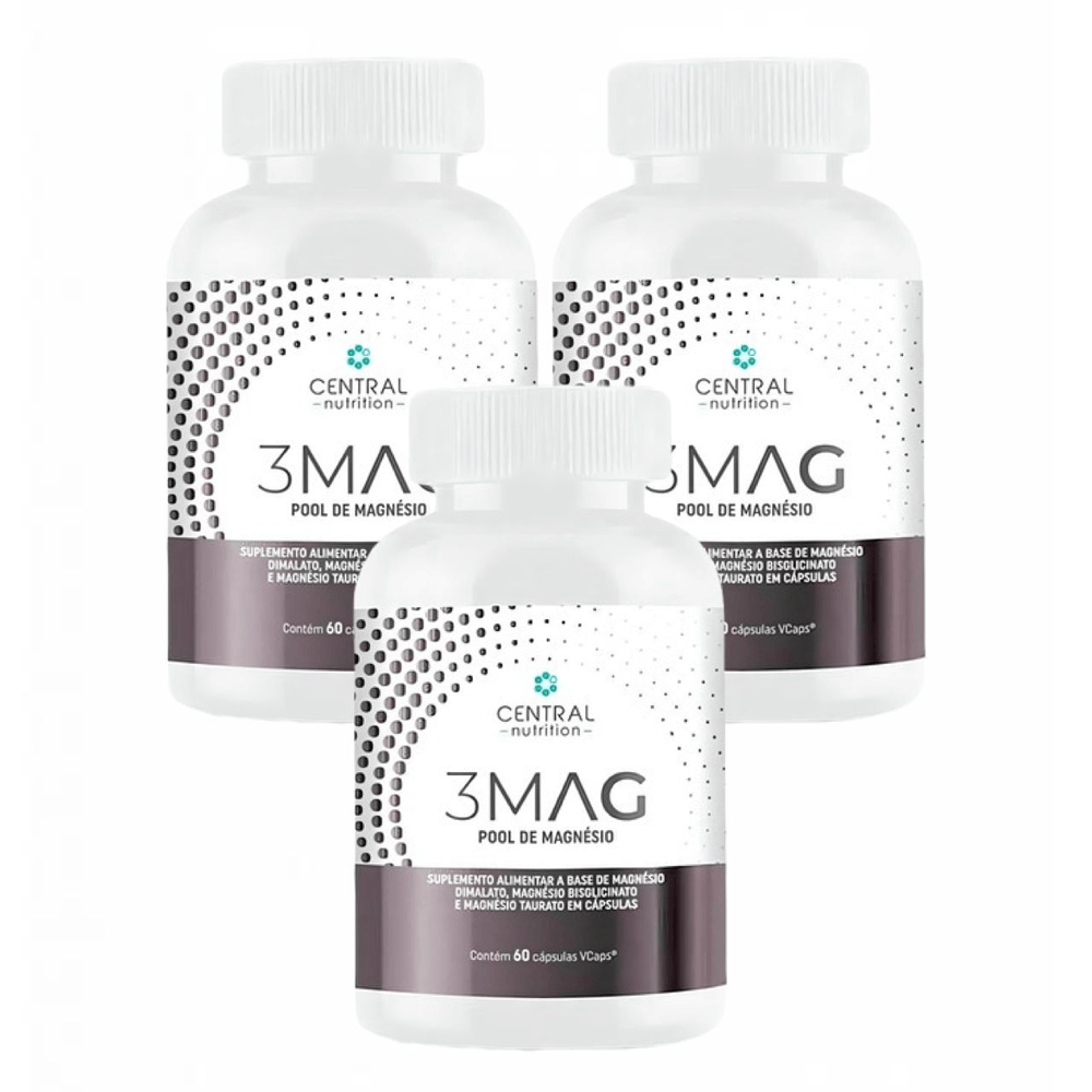3 MAG - POOL DE MAGNÉSIO - kit contendo 3 frascos com 60 cápsulas cada É um suplemento alimentar inovador, formulado à base de três poderosas fontes de magnésio: (i) magnésio melato, também conhecido como magnésio dimalato; (ii) magnésio bisglicinato, também conhecido como magnésio quelato; e (iii) magnésio taurato. INGREDIENTES: Magnésio Bisglicinato, Magnésio Dimalato, Magnésio Taurato, Antiumectante, Dióxido de Silício, Fosfato de Cálcio Tribásico, Lubrificantes, Estearato de Magnésio. Cápsulas: VCaps (hidroxipropilmetilcelulose). Recomendação de uso do Fabricante: Tomar 1 cápsula 2 vezes ao dia.ATENÇÃO: Não contém lactose. Não contém açúcar. Não contém lactose. Não contém sódio. Este produto não é um medicamento. Não exceder a recomendação diária do fabricante do produto. Sempre consumir com supervisão médica. Produto dispensado de Registro conforme RDC 240/2018.