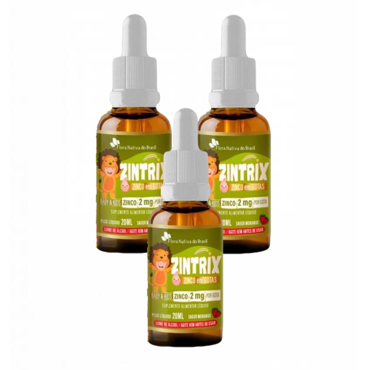 ZINTRIX - Zinco Infantil. Kit contendo 3 frascos com 20ml cada, sabor morango.