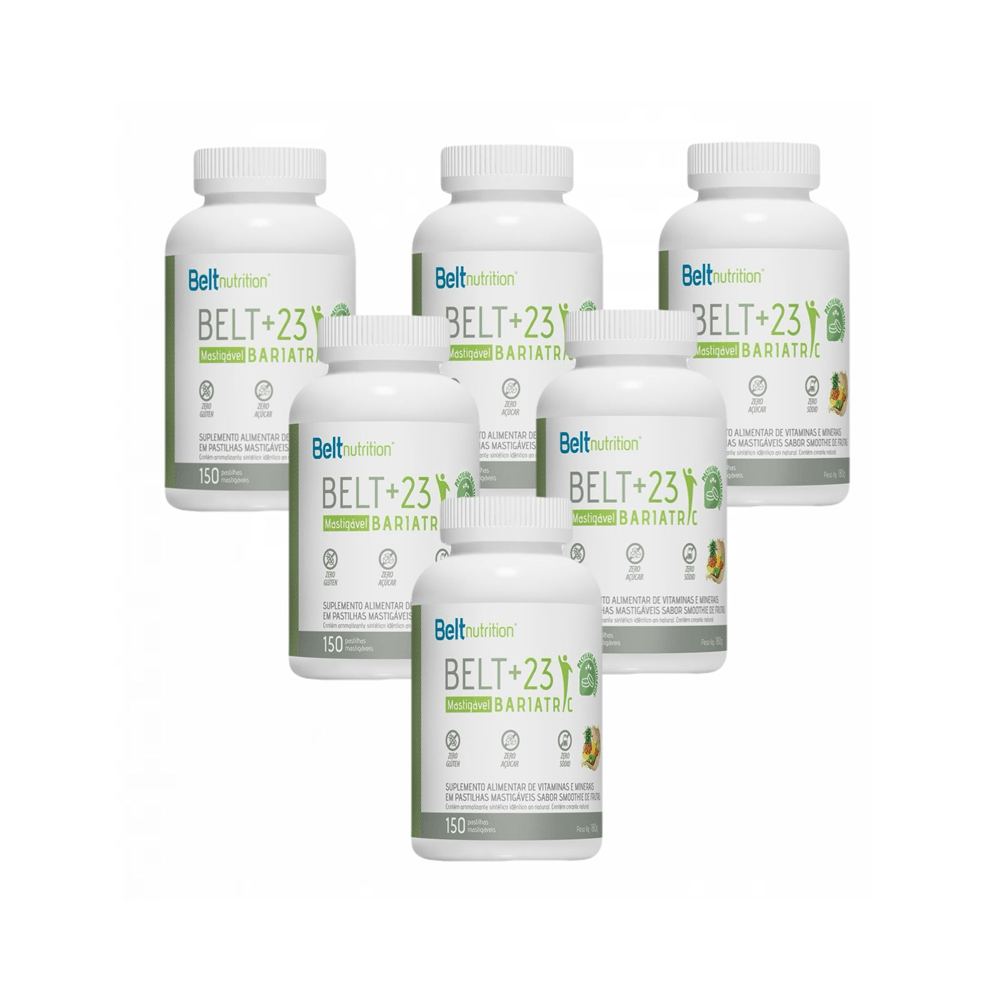 BELT +23 MASTIGÁVEL - SABOR SMOOTHIE DE FRUTAS. Kit contendo 6 frascos com 150 pastilhas cada.Multivitamínico e multimineral formulado especialmente para os bariátricos. Possui alta concentração de vitaminas e minerais na forma de mini pastilhas mastigáveis, oferecendo um aporte nutricional completo e de forma prática.É um dos mais completos e balanceados do mercado, possui vitaminas na forma ativa e minerais quelatos, o que favorece em até 90% a absorção e facilita o aporte de nutrientes.*Produto sensível ao calor, manter em local fresco e arejado.*Não recomendamos manter o produto por longo período dentro do porta cápsula.*Não contém açúcar. Isento de Registro no MS/ANVISA de Acordo com RDC N°240/2018.Atenção: Este produto não é um medicamento. Não exceder a recomendação diária do fabricante do produto. Sempre consumir com supervisão médica.
