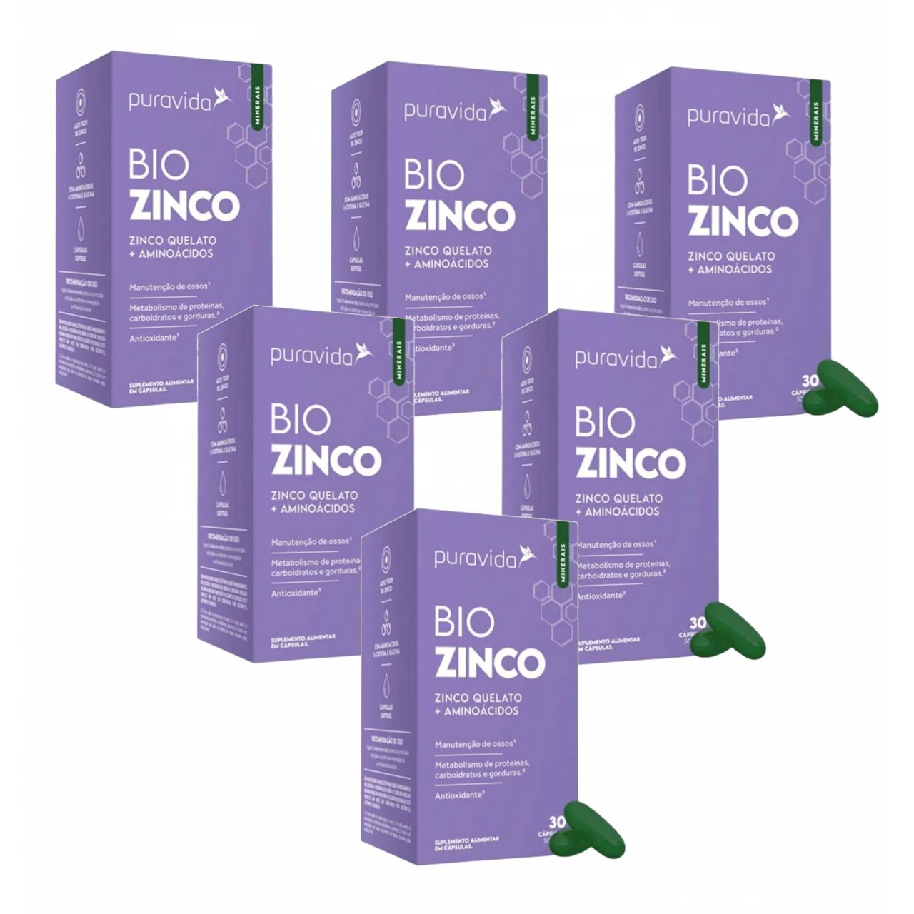 Bio Zinco PuraVida - Zinco Quelado + Aminoácidos - Kit contendo 6 frascos co 30 cápsulas cada.