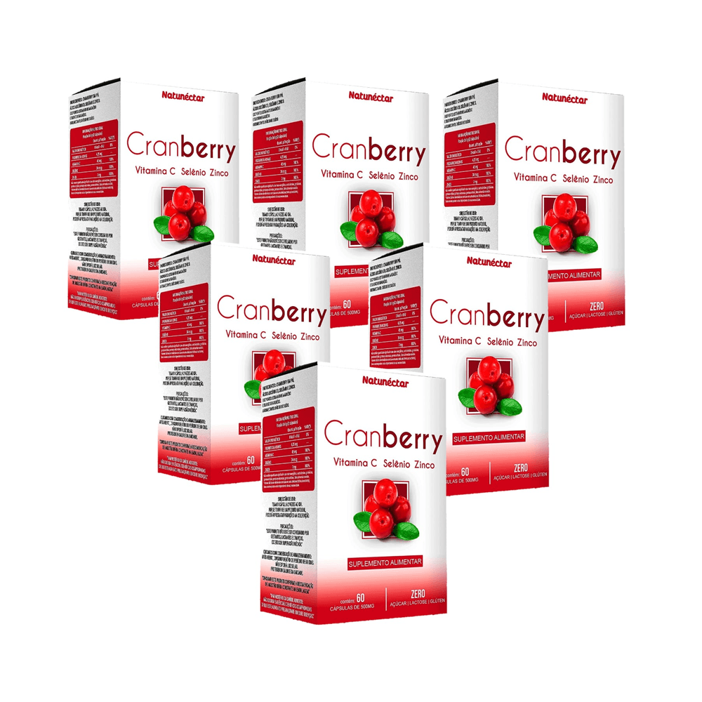 CRANBERRY. Kit contendo 6 caixas com 60 cápsulas cada.Este suplemento alimentar conta com a associação do Cranberry à Vitamina C, ao Selênio e ao Zinco, potencializando seu efeito.Composição: Cranberry, Vitamina C, Selênio e Zinco. 0% Açúcar | 0% Lactose | 0% Glúten.Sugestão de uso do Fabricante: Recomenda-se a ingestão de 1 cápsula 2 vezes ao dia.Isento de Registro no MS/ANVISA de acordo com RDC Nº 240/2018.Atenção: Este produto não é um medicamento. Manter fora do alcance de crianças. Não exceder a recomendação diária do fabricante do produto. Sempre consumir com supervisão médica.