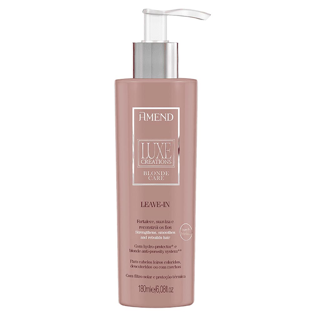 Indicação: Ressecados, desidratados e opacos.Princípios Ativos: Com Hydro-Protector e Blonde Anti-porosity System.Ação: Com filtro solar e proteção térmica, a fórmula proporciona proteção da cor e força, ajudando a eliminar o aspecto áspero e poroso dos fios para ficarem macios e brilhantes. Ajuda a aumentar o diâmetro dos fios, melhora a penteabilidade e facilita a escovação.Principais Benefícios: Retém a água nos fios, mantendo-os hidratados por muito maistempo, dando aos cabelos uma nova vida; Proporciona aos cabelos loiros, estressados por processosquímicos mais força, elasticidade e penteabilidade; Reconstrói as ligações rompidas, eliminando a porosidade dosfios e repondo a massa capilar perdida; Recupera a fibra e aumenta o diâmetro dos fios,deixando-os macios e brilhantes; Repõe os aminoácidos perdidos e proporciona proteção da cor; Livre de Parabenos, Petrolatos, Corantes e Sulfato. Modo de Uso: Após lavar os cabelos com a linha Amend Blonde Care, aplique o Leave-in nos cabelos molhados do comprimento dos fios até as pontas, evitando a raiz. Não enxaguar. Finalize como de costume.Precauções: Mantenha fora do alcance de crianças, em lugar fresco e ao abrigo de luz intensa. Não ingerir. Em caso de contato com os olhos, enxaguar imediatamente com água abundante. USO EXTERNO.