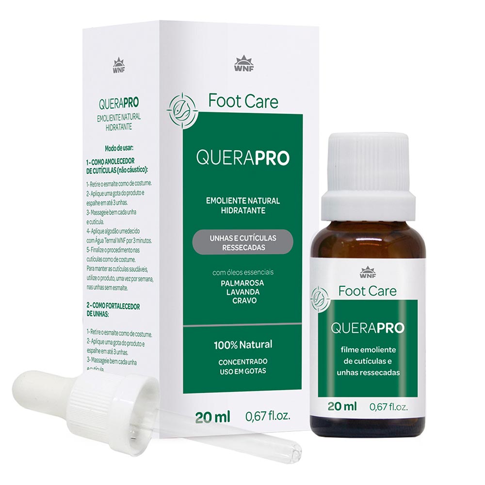 Modo de usar: Aplique 1 gota do querapro da WNF sobre o corpo das unhas abrangendo até o eponiqueo e as pregas periungueais, durante o profedimento da remoção da cutícula. Deixe agir por 3 minutos e siga com o procedimento podológico sem remover o produto.