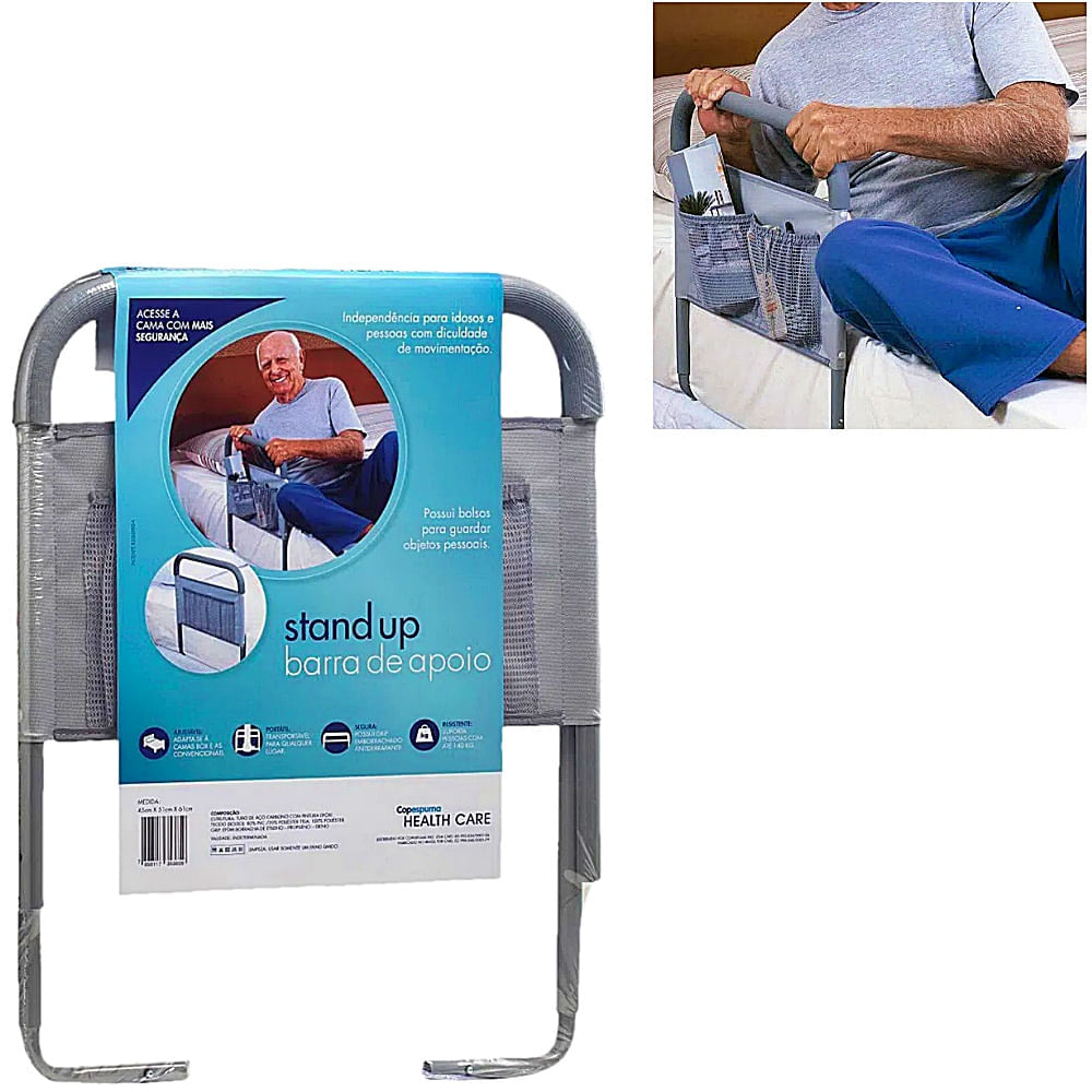Características:Acesso a cama com mais segurança;Independência para idosos e pessoas com dificuldade de locomoção;Portátil e pode ser levado para qualquer lugar;Resistente até 140 kg para movimento de alavanca;Possui grip emborrachado antiderrapante;Possui bolso para guardar objetos pessoais;Fácil instalação, não precisa de ferramentas;Não exige instalação: é colocada sob o colchão;Pode ser adaptado em camas box ou convencionais;Benefícios:SEGURA: Possui Grip emborrachado antiderrapante
