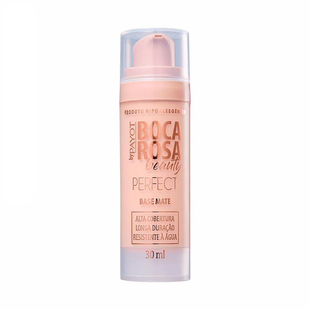 Base líquida com acabamento matte. Hipoalergênica, Payot Boca Rosa Beauty oferece alta cobertura e permite construir camadas na make.