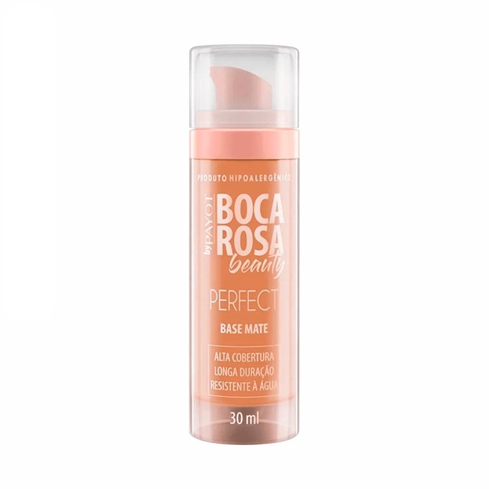 Base líquida com acabamento matte. Hipoalergênica, Payot Boca Rosa Beauty oferece alta cobertura e permite construir camadas na make.