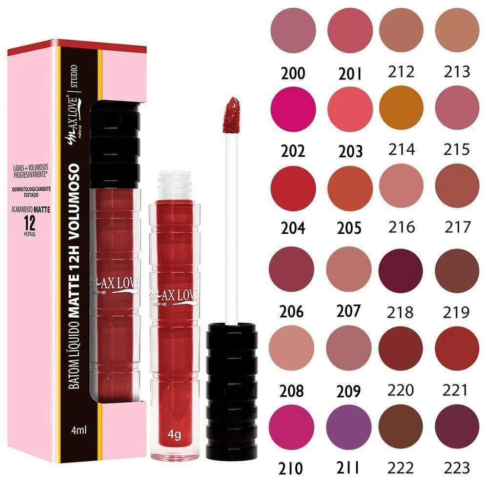 Líquido Volumoso Max Love proporciona aumento dos lábios e seu efeito é progressivo: quanto mais usa, mais o aumento fica visível. Além disso, ele é dermatologicamente testado, tem duração de 12 horas e acabamento matte.4 mL. Textura suave e cremosa e ainda não transfere, não borra e não sai. Matte é o tipo de batom com a maior intensidade de cor, graças a grande quantidade de pigmentos na composição. O aspecto dele é seco, sem brilho e de acabamento discreto.