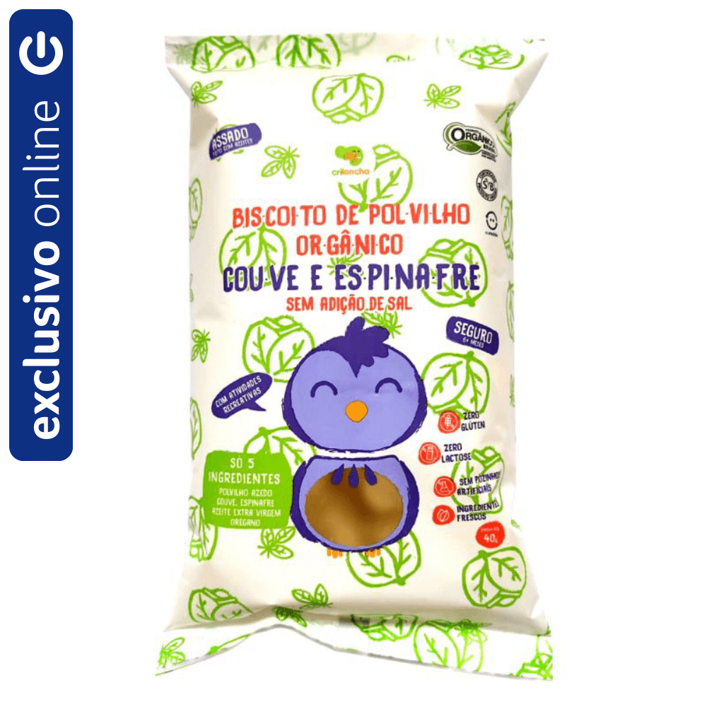 O Biscoito de Polvilho Orgânico sabor Couve e Espinafre 40g da Crilancha é uma versão sem sal, pensada especialmente para as crianças a partir dos 6 meses de idade. Ele é produzido com ingredientes selecionados e orgânicos, sem a adição de corantes e conservantes. Pode ser consumido por crianças com alergias alimentares ao leite, glúten e ovo. Práticos e muito saborosos, são ideais para lanches rápidos.