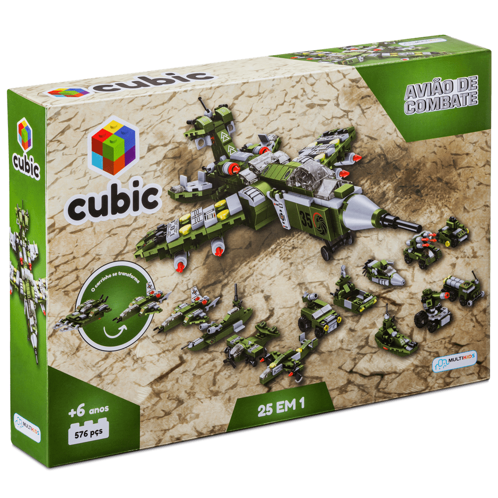 Com o Cubic 25 em 1 da Multikids a diversão com blocos de montar é garantida! São mais de 500 peças para montar 24 diferentes tipos de veículos de ataque ou montar um incrível e poderoso Avião de Combate! Diversas peças para montar os diferentes cenários e auxiliar o desenvolvimento da imaginação, coordenação motora, concentração e novos desafios.Possui compatibilidade com outros blocos e acompanha manual de instruções. Indicado para 6+ anos. Imagens meramente ilustrativas.