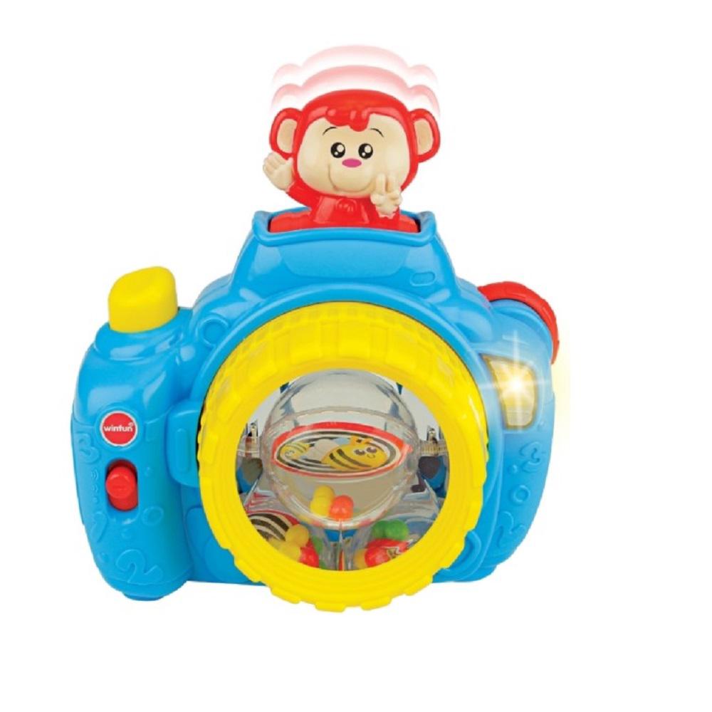 - Recursos: Botão do obturador, pop-up de macaco, lentes giratórias, espelho reflexivo, bola giratória, contas de chocalho, botão giratório click-clack, anel de foco, sons divertidos, melodias e luzes piscando.