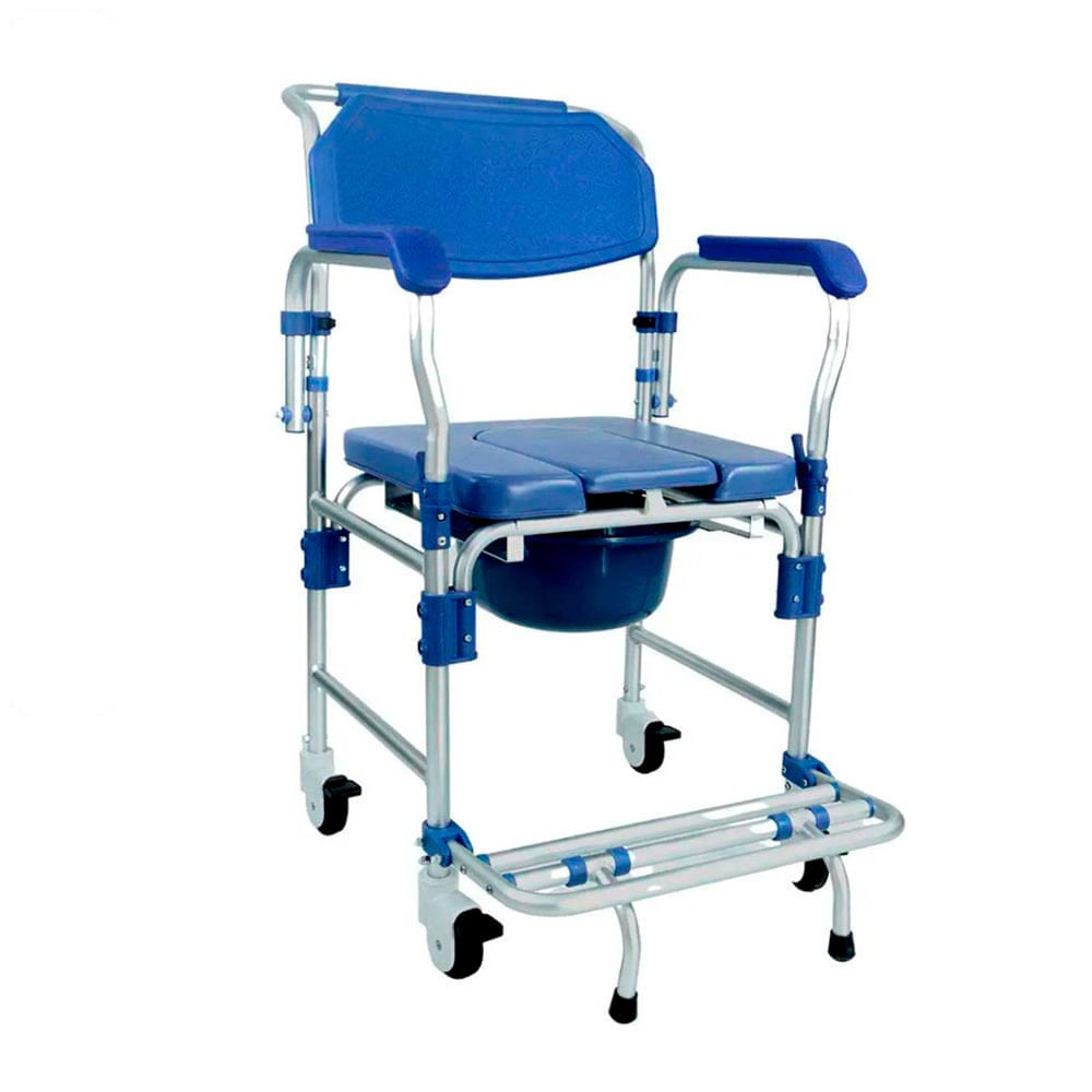 - Cadeira de banho multifuncional em alumínio para uso sobre vaso sanitário, banho e locomoção interna