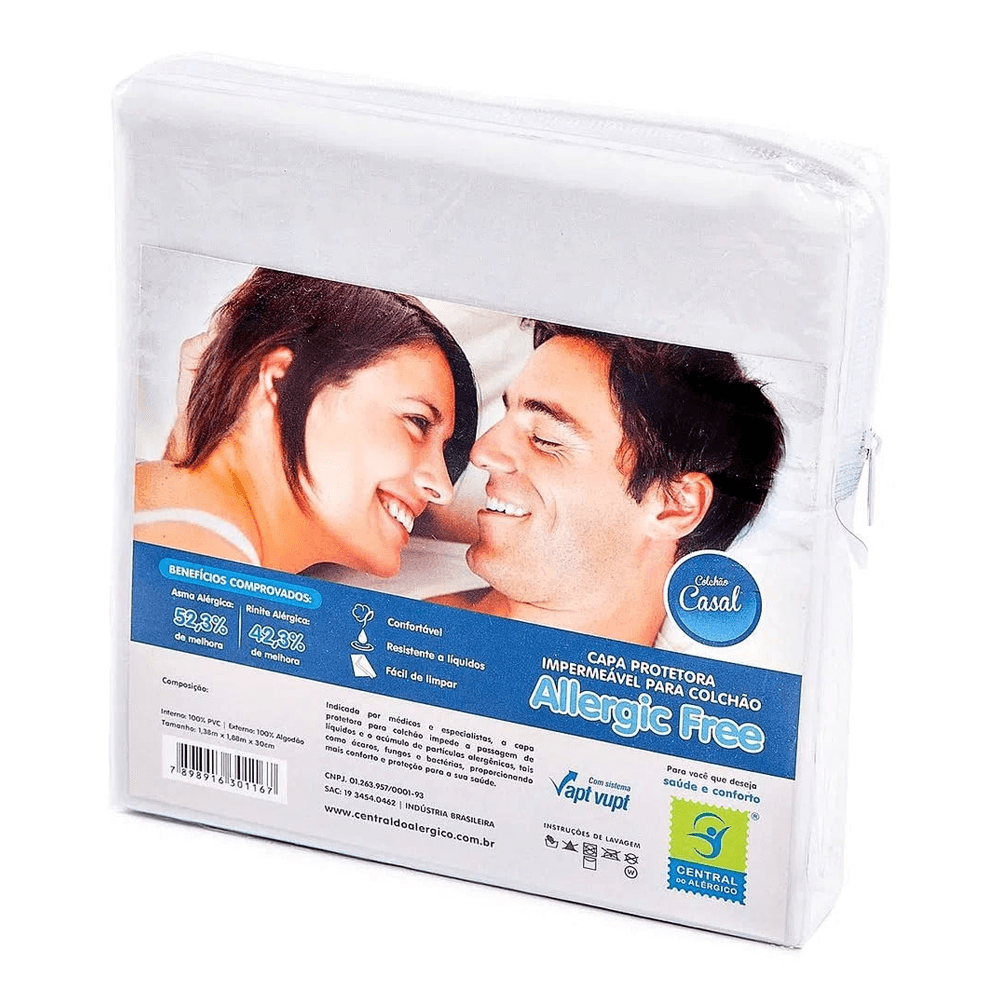 A Capa Protetora Impermeável para Colchão de Casal Allergic Free, da Central do Alérgico, é confeccionada em 100% algodão com proteção interna em 100% PVC. Possui o exclusivo modelo Vapt Vupt com elástico em toda a volta, facilitando a colocação e ajudando a proteger o colchão das impurezas do dia a dia, garantindo maior vida útil.