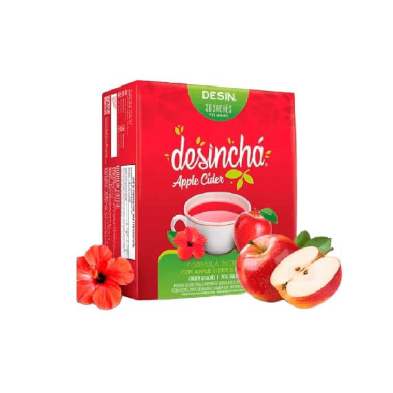 O Desin Apple Cider com Hibisco Desinchá, contém 30 saches e é elaborado com hibisco, chá preto, maçã, beterraba e cúrcuma, em uma proporção exata entre elas, garantindo sabor, aroma e frescor.