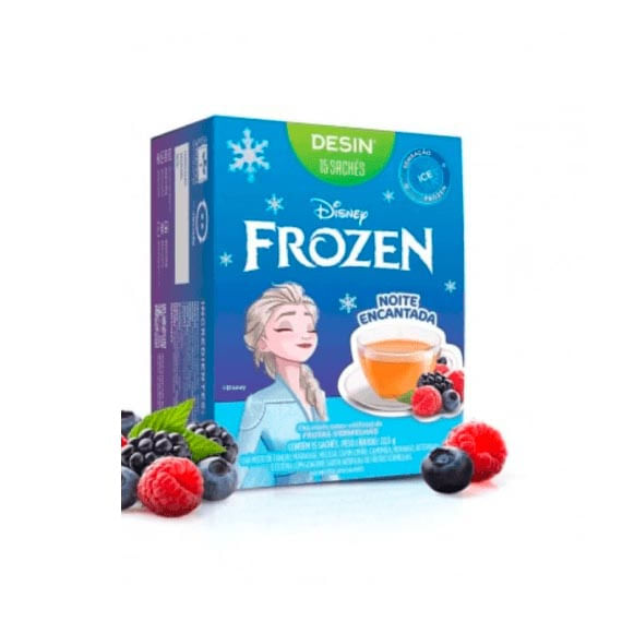 O Chá da Frozen sabor frutas vermelhas da Desinchá, contém 15 saches e é elaborado com funcho, maracujá, melissa, capim-limão, camomila, morango, beterraba, estévia e gengibre em uma proporção exata entre elas, garantindo sabor, aroma e frescor.
