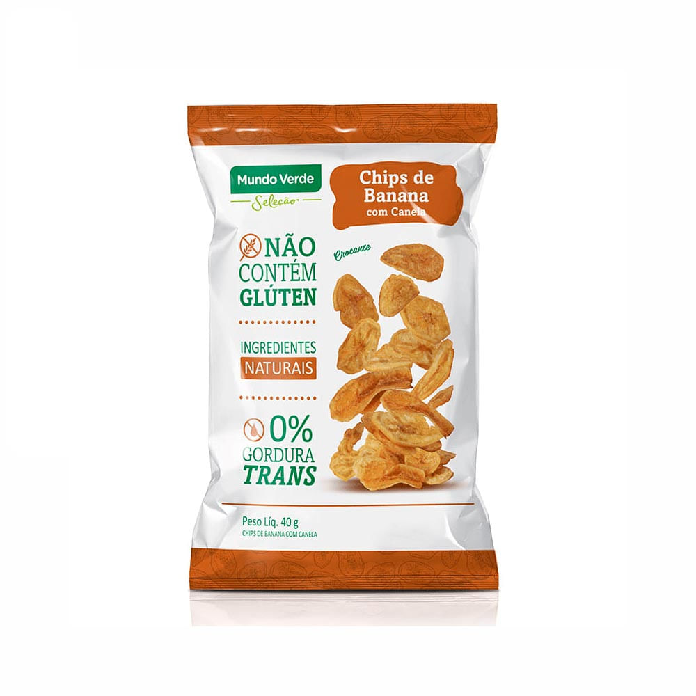O Chips de Banana com Canela Chips Mundo Verde Seleção 40g, é feito à base de banana verde in natura com adição de óleo de palma, açúcar, canela e Vitamina E.