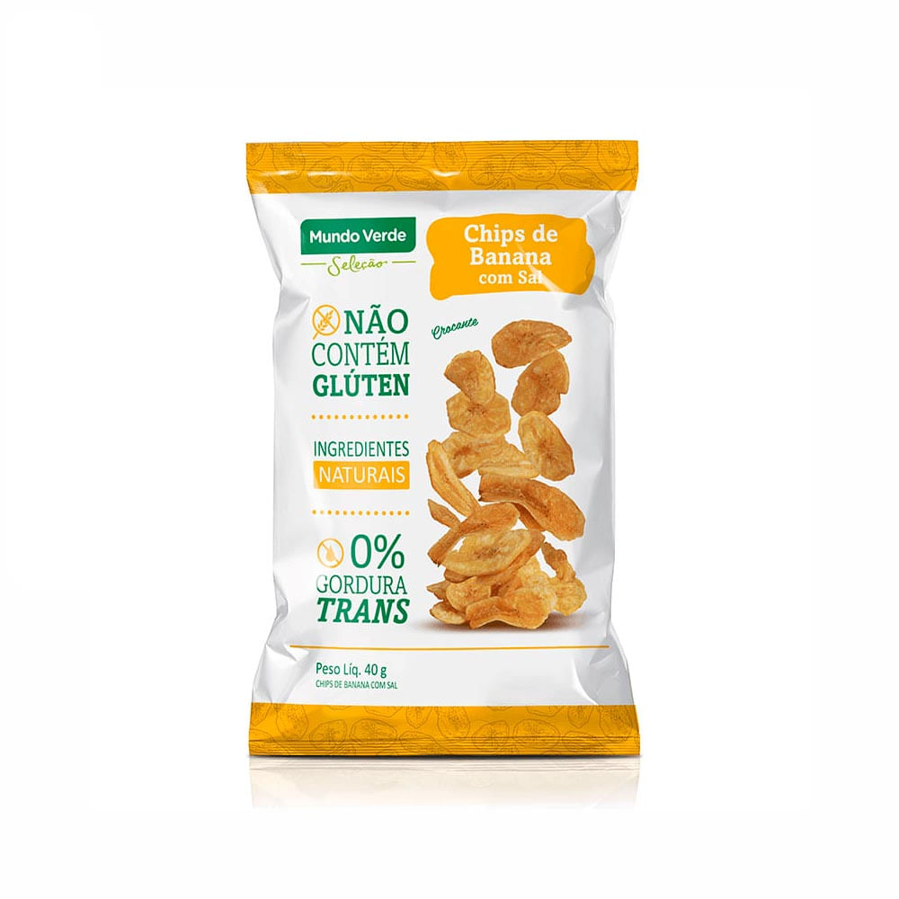 O Chips de Banana com Sal Mundo Verde Seleção 40g, é feito a base de banana verde in natura com adição de óleo de palma e vitamina E. Cada porção fornece 1,5g de fibras.É uma alternativa de snack com ingredientes naturais para celíacos e/ou intolerantes ao glúten, além disso, é livre de gorduras trans, de conservantes, corantes e açúcar.