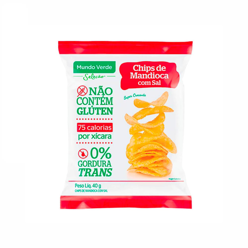 O Chips de Mandioca com Sal Mundo Verde Seleção 40g;são chips crocantes, isentos de lactose, glúten, conservantes e aromatizantes artificiais.