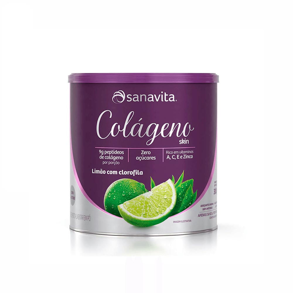 O Colágeno skin sabor limão com clorofila, da Sanavita, é um suplemento alimentar que fornece 9g de peptídeos ativos de colágeno combinada a vitaminas e minerais. Atende 100% das necessidades diárias das vitaminas A, C, E e o mineral zinco. Não possui adição de açúcar ou maltodextrina.