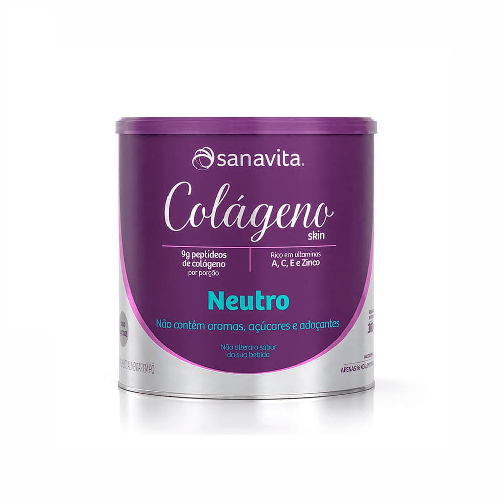 O Colágeno skin sabor Neutro, da Sanavita, é um suplemento alimentar que fornece 9g de peptídeos ativos de colágeno combinada a vitaminas e minerais.