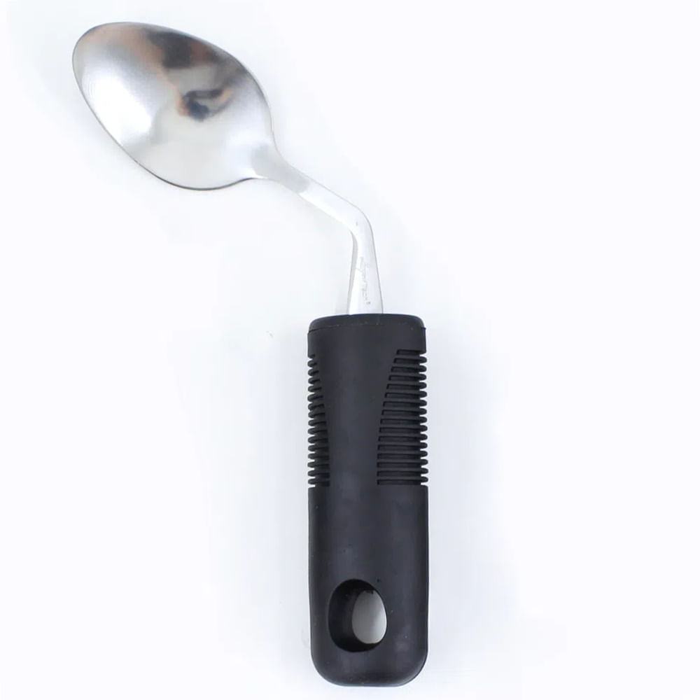 Produto: Talher Curvado com Cabo Engrossado LongeVitech. Desenvolvido para pessoas com amplitude de movimento limitada, facilitando a alimentação independente.