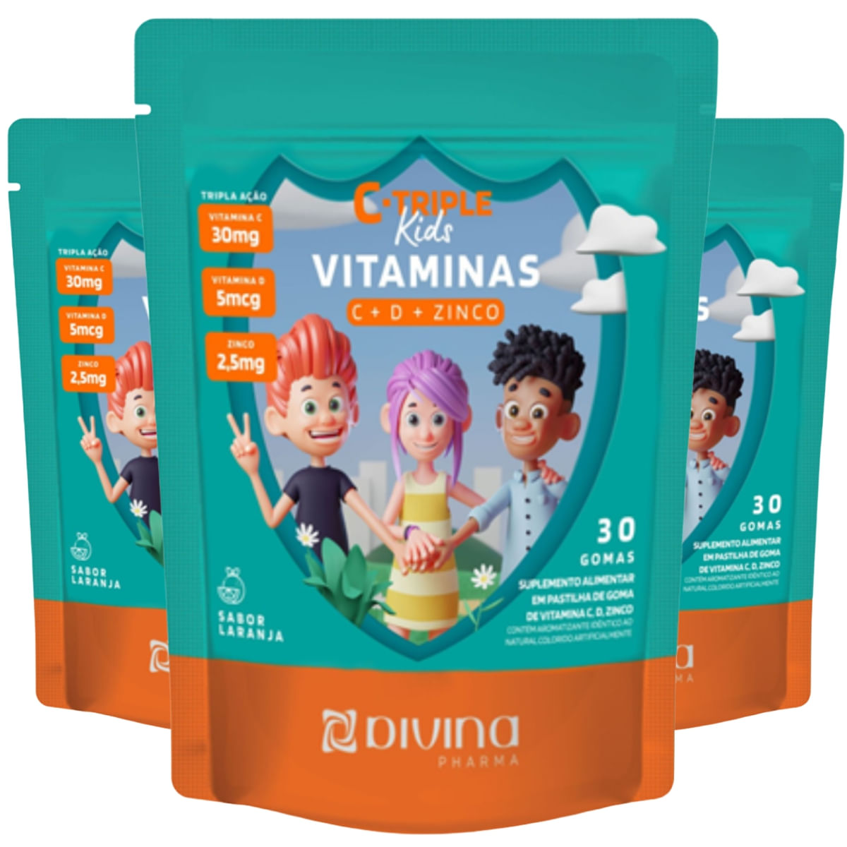 - 1 Unidade do produto: COMBO COM 3 C-TRIPLE KIDS VITAMINAS C + D + ZINCO COM 30 GOMAS CADA - DIVINA PHARMA