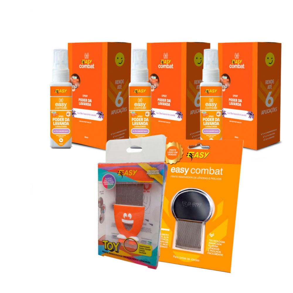 - 3 Sprays Combat 60ml: O Spray Combat / Poder da lavanda é implacável, rende até 6 (seis) aplicações, fórmula 100% natural. O produto é desenvolvido no Brasil, livre de permetrina e demais ingredientes tóxicos. Utiliza o óleo essencial de lavanda e silicones de alta densidade criando uma película que envolve e paralisa, sem prejudicar a saúde e sem adição de toxinas. O produto é recomendado para adultos e crianças de qualquer idade e também pode ser utilizado em todos os tipos de cabelos.