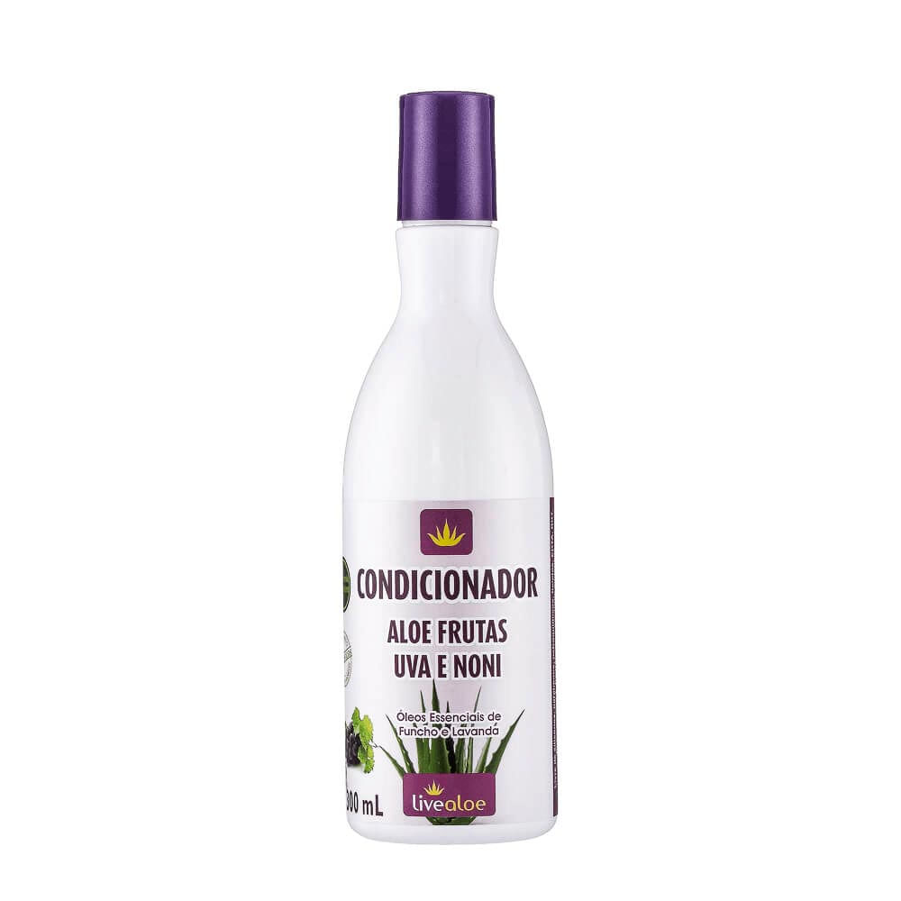 O Condicionador Natural de Aloe Frutas com Uva e Noni da Livealoe possui uma fórmula inovadora que nutre e fortalece os fios graças a aloe vera, que hidrata e nutre, o óleo de semente de uva, rico em vitamina E e ácido oleico que fortalecem o fio e ajuda-o a crescer mais rápico, a manteiga de cupuaçu, que confere brilho e maciez e os extratos de noni e uva, que protegem os fios contra as agressões químicas e diárias, são antioxidantes e nutritivos, evitado o envelhecimento precoce dos fios. É ótimo para ser levado para a praia, pois não deixa o cabelo ficar com aspecto de ressecado.