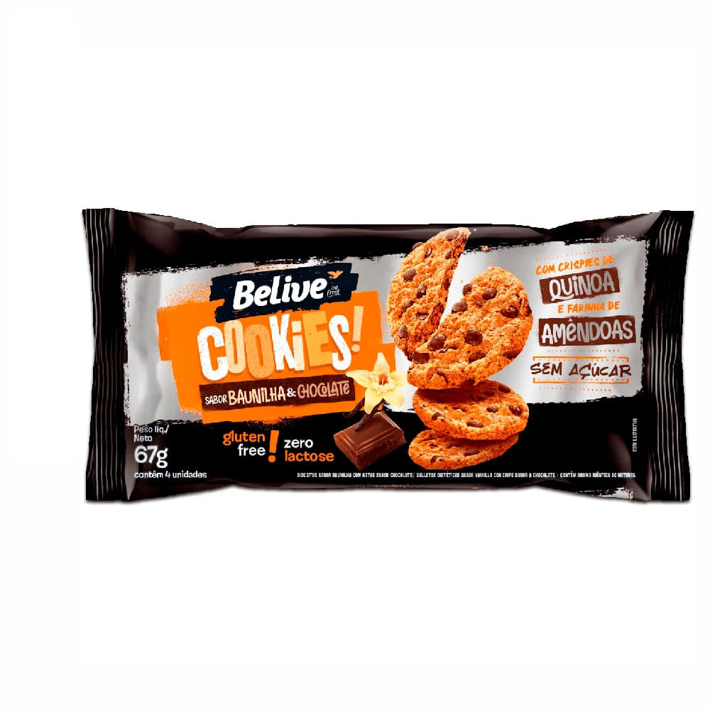 O Cookies Zero Açúcar Baunilha e Gotas Chocolate Belive, é feito com farinha de amêndoas, crispies de quinoa e muuuitas gotas de chocolate. Tudo isso para que cada momento ao seu lado seja ainda mais incrível.