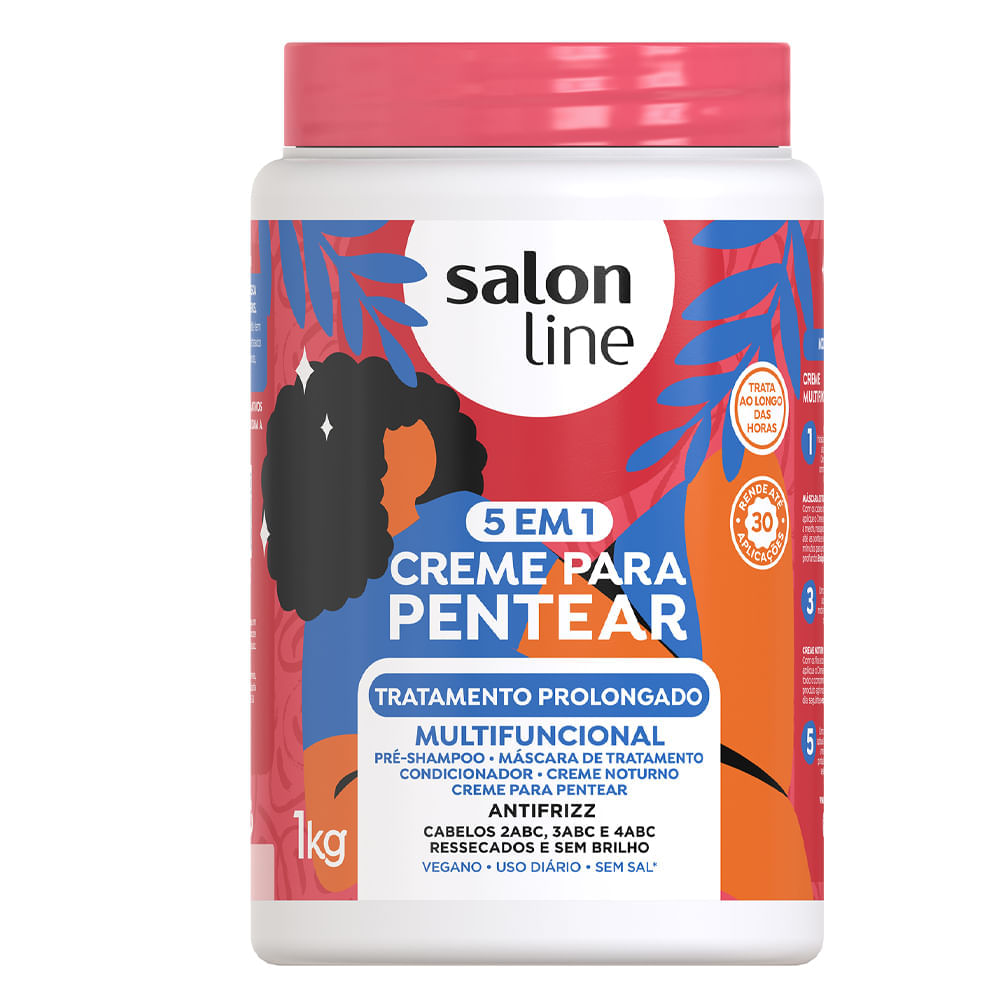 O Creme De Pentear Salon Line 5 Em 1 Tratamento Prolongado 1Kg, enriquecido com glicerina vegetal, niacinamida e biotina, oferece hidratação intensa e combate o ressecamento, proporcionando um brilho radiante.
