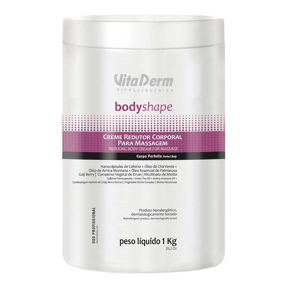 Creme de textura suave, não oleosa, de alto rendimento e deslizamento. Ativa a circulação periférica, hidrata, reduz medidas, gordura localizada, flacidez e celulite. É estimulante metabólico e lipolítico. Profissional. Tratar e reduzir medidas, flacidez, celulite e gordura localizada com o auxílio de massagem modeladora. Principais Ativos: Extratos de: goji berry, arnica, chá verde, cafeína, quinoa, polén, urtica, pfaffia, gérmen de trigo e nicotinato de metila. Ácidos limoleico e oleico.Modo de Uso:Aplicar sempre após a esfoliação física, uma quantidade suficiente e realizar movimentos de massagem modeladora. Registro Anvisa: 25351.393085/2018-47 Linha body shape profissional Vitaderm Hipoalergenica entrega o que promete em seus produtos. A Vitaderm é pioneira, no Brasil, em pesquisa e produção de biocosméticos, de tratamento para pele e cabelo. Fundada em 1984, pelo Dr. Marcelo Schulman, a marca, já com 37 anos, carrega em seu DNA a busca constante por inovação, tecnologia de ponta e, principalmente, respeito ao consumidor, aos parceiros e ao meio ambiente. Somos uma empresa de cosméticos brasileira referência no mercado de beleza e estética. Os produtos incríveis da Vitaderm são dermatologicamente testados pela Bioengenharia Cutânea, proporcionam resultados altamente eficazes e duradouros. A fabricação de cosméticos com princípios ativos de última geração e qualidade comprovada atende as necessidades dos profissionais e clientes, levando mais beleza e saúde a cabelos, pele e corpo. A essência da marca Vitaderm reforça sua atenção e seus cuidados especiais com os profissionais e clientes finais que utilizam sistematicamente seus produtos.