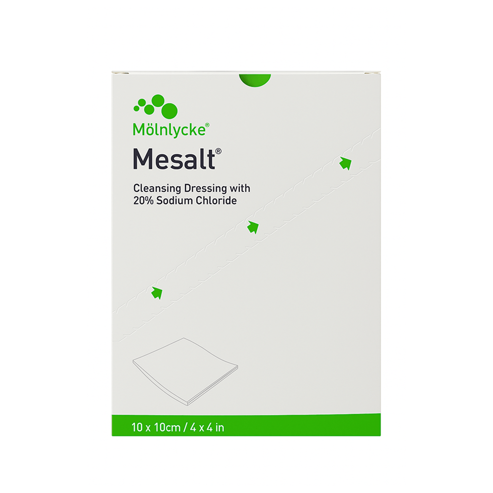 O Mesalt 10×10 cm, da Mölnlycke, é um curativo estéril indicado para feridas com exsudato moderado a alto, inclusive aquelas com sinais de infecção ou presença de tecido desvitalizado. Composto por tecido não tecido (viscose/poliéster) embebido com 20% de cloreto de sódio, o Mesalt promove um ambiente hipertônico que atrai o excesso de fluido, bactérias e resíduos necróticos da lesão, favorecendo a limpeza e o processo de cicatrização.