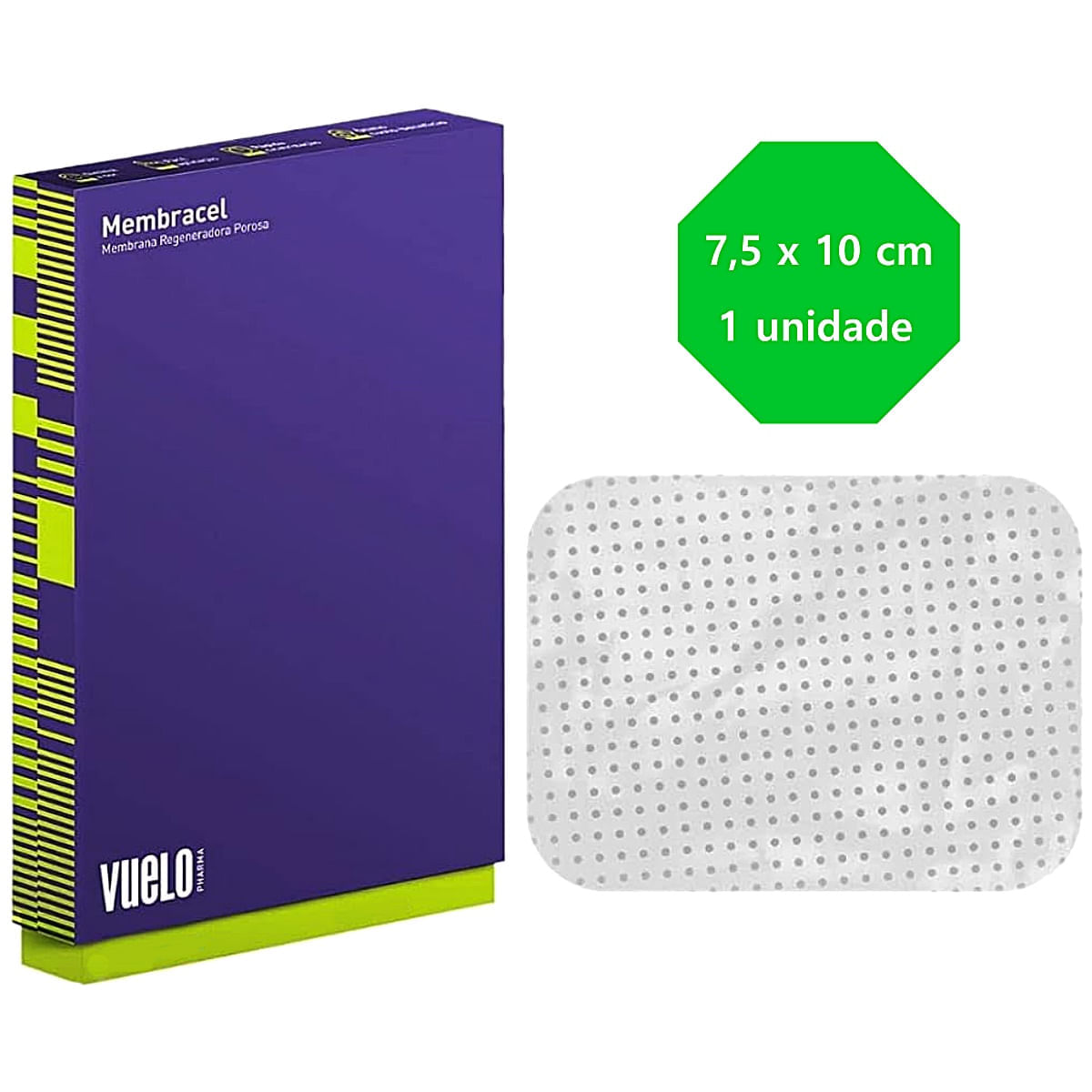 5cm Poros Médios - VUELO PHARMAO Curativo Membracel Membrana Regeneradora é um regenerador de pele retangular 7,5cm x 10cm com 1 unidade