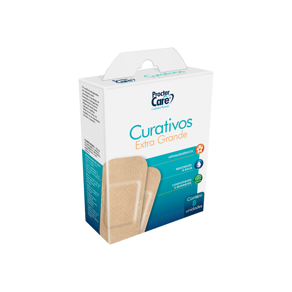 Os Curativos Bege Extra Grande Procter Care foram desenvolvidos para oferecer proteção eficaz em ferimentos maiores. Com dorso perfurado de polietileno e almofada absorvente, proporcionam conforto, fixação segura e praticidade no cuidado diário com a pele.