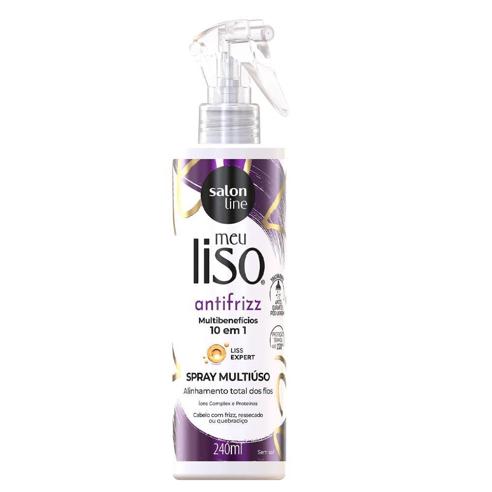 O Defrizante Salon Line Spray Meu Liso 10Em1 240ml proporciona um alinhamento total dos fios com sua fórmula enriquecida com íons complexos e proteínas.