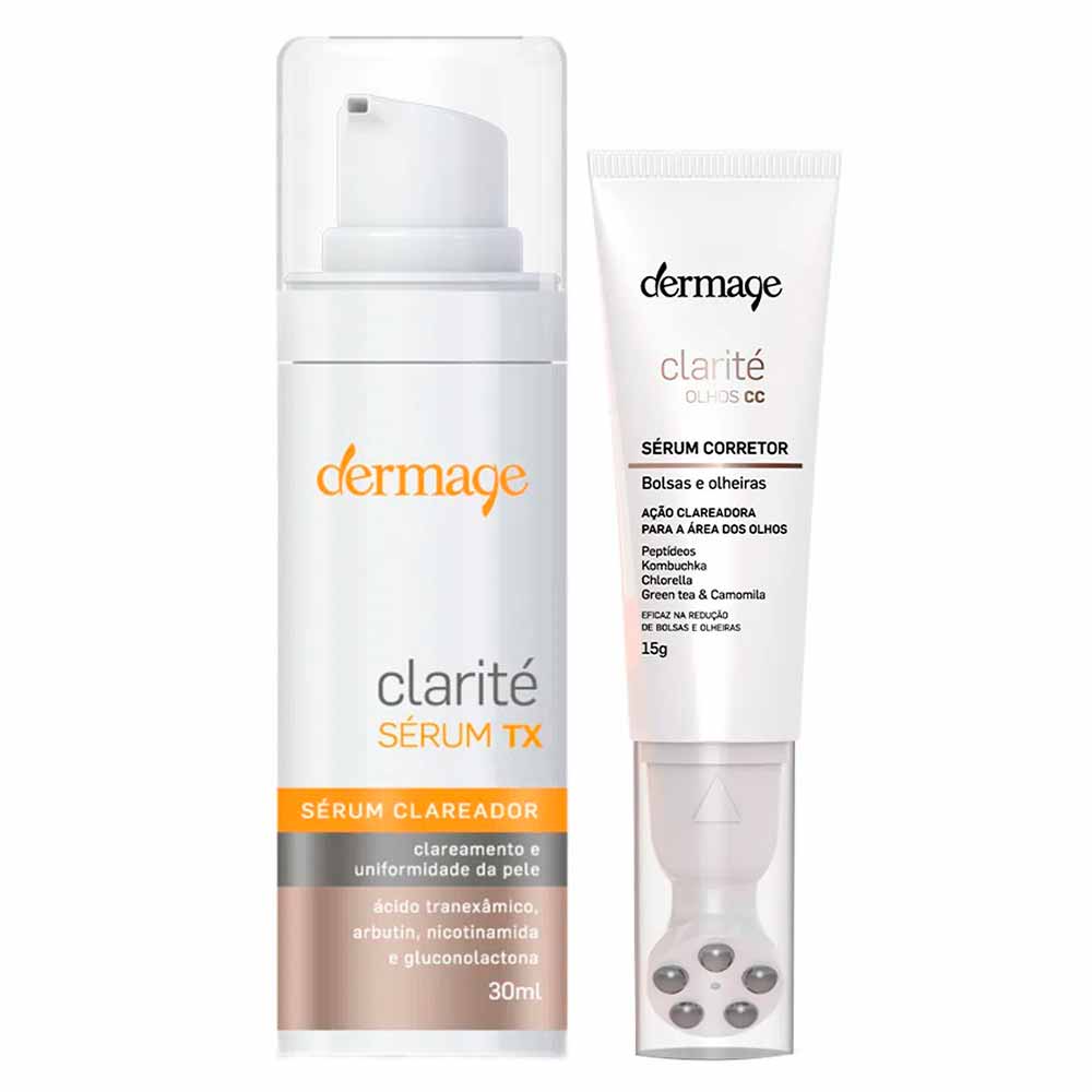O kit Contém: 1 Sérum Clareador para olhos Dermage Clarité CC - 15g1 Sérum Clareador Dermage - Clarité Sérum Tx - 30mlO que é e para que serve?O Dermage Clarité Kit combina dois poderosos séruns clareadores: o Sérum Corretor Clarité Olhos CC e o Sérum Clareador Clarité TX , formando um tratamento completo e eficaz contra bolsas, olheiras, melasma e manchas de origem inflamatória. Este kit foi desenvolvido com tecnologia avançada para proporcionar uma pele rejuvenescida, uniforme e radiante.Quais os Benefícios do Kit?Ao usar regularmente o Dermage Clarité Kit, você notará uma série de benefícios visíveis na sua pele.Para os olhos: - Redução das bolsas.- Diminuição das olheiras.- Ação anti-idade.- Melhora do tônus vascular. Para as marcas: - Uniformização do tom da pele.- Prevenção contra manchas pós-inflamatórias causadas por procedimentos dermatológicos.- Tratamento eficaz do melasma e fotoenvelhecimento.Os ativos presentes no kit trabalham em sinergia para combater sinais visíveis de envelhecimento ao mesmo tempo em que clareiam a pele. Elementos como cafeína, kombucha, peptídeos, chlorella e green tea atuam diretamente na redução do inchaço dos olhos enquanto melhoram a resistência da pele ao estimular a produção de colágeno. Já ingredientes como nicotamina 4%, arbutin 1%, ácido tranexâmico (AT) 3% e gluconolactona 2% garantem um efeito despigmentante potente aliado à hidratação profunda.Como funciona cada ativo presente no Dermage Clarité Kit? Os ativos específicos desempenham papéis essenciais garantindo transformação visível duradoura:- Cafeína: reduz permeabilidade capilar, vasos estimulando lipólise além melhorar tônus vascular diminuindo bolsas;- Kombucha: antioxidante poderoso ilumina suaviza previne glicação atua redensificando textura dérmica geral;- Peptídeos: combatem edemas, reduzem pigmentação vascular proporcionado aspecto mais claro revitalizado a área periocular;- Chlorella: antioxidante natural, melhora resistência cutânea, estimula produção de colágeno tipo I, firmeza e elasticidade nos tecidos adjacentes a região tratada, resultando aparência jovem vibrante. Modo de Uso:Para obter os melhores resultados com o Dermage Clarité Kit:Sérum Corretor Clarité Olhos CC:1. Massageie delicadamente ao redor dos olhos sobre a pele limpa duas vezes ao dia, utilizando esferas massageadoras integradas no aplicador.2. Utilize a ponta dos dedos para suavizar qualquer excesso de produto após aplicação.Sérum Clareador Clarité TX:1. Pela manhã ou à noite aplique sobre a pele limpa com movimentos suaves até completa absorção.2. Recomenda-se associar seu uso matinal com protetor solar para máxima proteção contra raios UV.Posso usar durante o dia? Sim! Ambos os produtos foram formulados pensando nas necessidades diárias da sua rotina skincare sem comprometer eficácia nem segurança durante exposição solar desde que acompanhado por protetores adequados quando necessário!Qual é o diferencial do Dermage Clarité Kit comparado aos outros produtos similares no mercado? O grande diferencial está na combinação única dos componentes altamente tecnológicos desenvolvidos especificamente tratar problemas pigmentares diversas origens conjugando eficácia comprovada clinicamente.