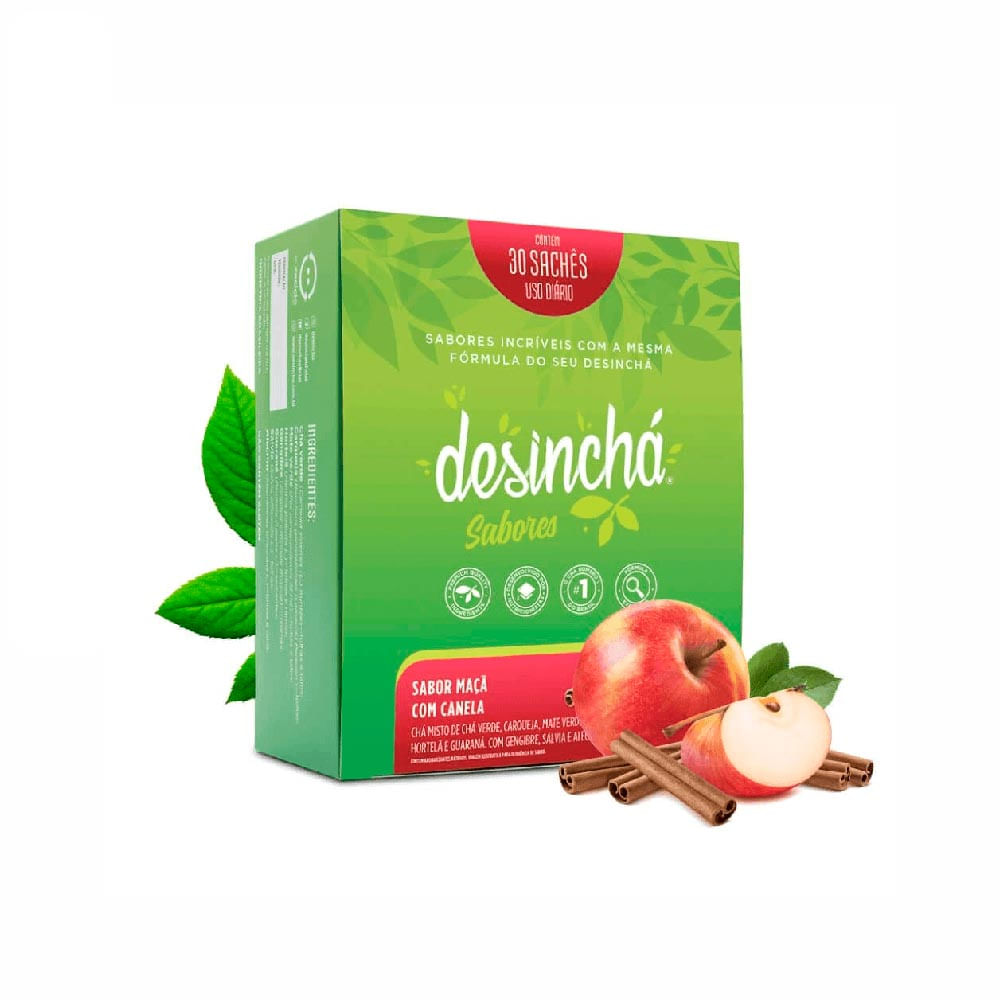 O Desinchá Maçã e Canela Desinchá com 30 sachês, é um chá feito a partir de 8 ervas com a proporção exata entre elas, ainda adiciona ao seu sabor característico a doçura da maçã com o toque levemente picante da canela.Sugestão de consumo:Esquente 200ml de água até começar a ferver, depois adicione 1 sachê e tampe por 5 minutos e o seu chá estará pronto para consumo.Consuma 1 sachê por dia ou de acordo com a recomendação do nutricionista.Dica: Para consumir gelado, faça o mesmo processo anterior e adicione gelo ou deixe na geladeira até gelar. Pode ser conservado pronto na geladeira por até 24 horas.Motivos para escolher o produto:Sem caloriasSem glútenSem lactoseSem corantesSem aromatizantes artificiaisSem açúcarSem adoçantesSobre a marca:O Desinchátem uma fórmula que foi desenvolvida com base em estudos, testes e auxílio de nutricionistas, por isso é o chá mais recomendado por profissionais. Feito a partir de um blend perfeito de 8 ervas, cuidadosamente selecionadas e combinadas na proporção exata, para garantir sabor, aroma e frescor. Desinchá pode ser levado para qualquer lugar e te ajuda a se manter em forma, mesmo fora de casa.