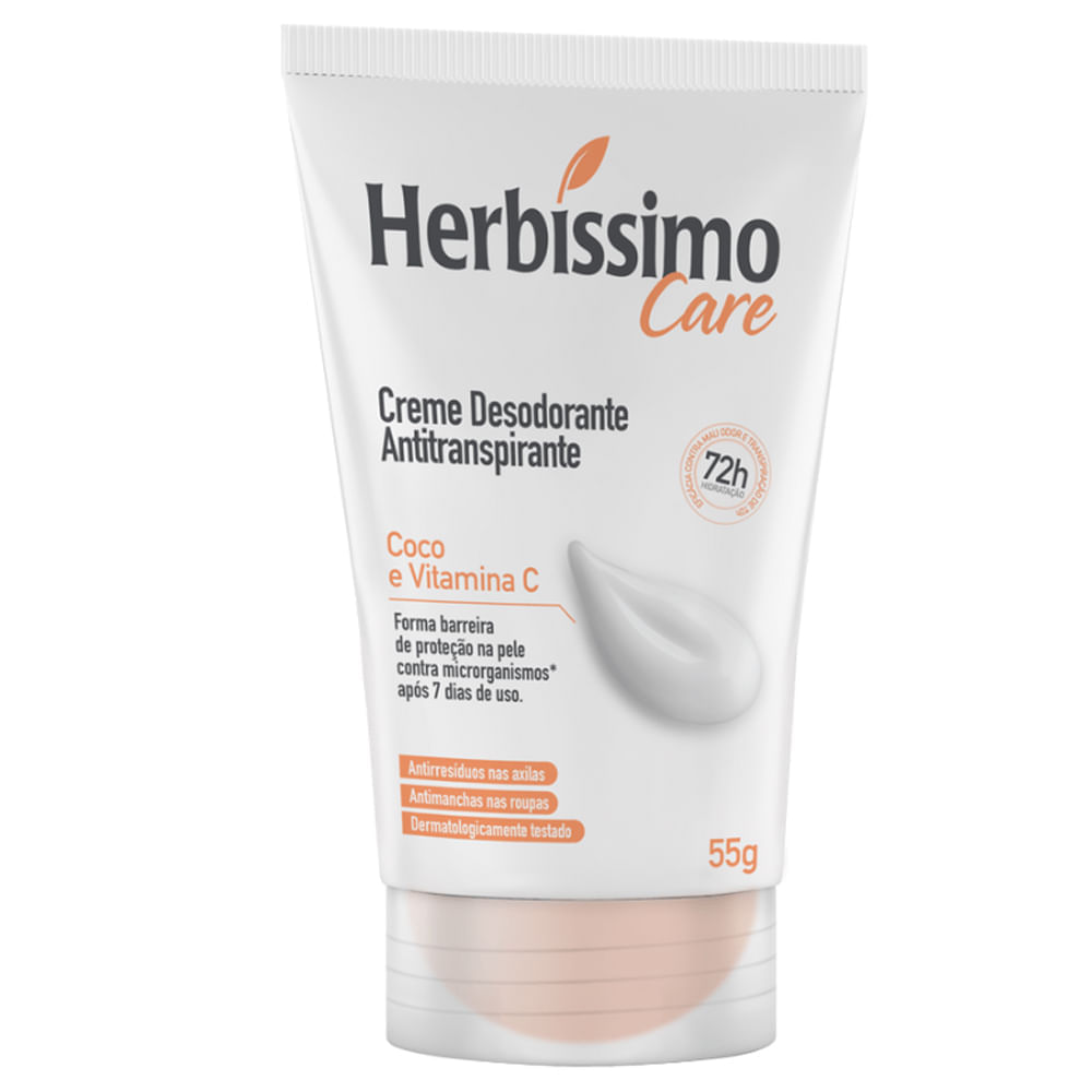 O Desodorante Antitranspirante Creme Herbíssimo Care Coco E Vitamina C 55g _x000D_ oferece proteção prolongada contra mau odor e transpiração por até 72 horas, enquanto hidrata e cuida da pele. Desenvolvido com ingredientes como Coco e Vitamina C, ele promove clareamento visível das axilas a partir de 3 dias de uso, prevenindo manchas e escurecimento da pele. Sua fórmula eficaz cria uma barreira protetora que reforça a saúde da pele com o uso contínuo, além de ser dermatologicamente testada, antimanchas nas roupas e antirresíduos.Benefícios:_x000D_ - Antirresíduos: Não deixa resíduos nas axilas._x000D_ - Hidratação intensa: Mantém a pele hidratada por até 72 horas._x000D_ - AClareamento visível: Clareia as axilas a partir de 3 dias de uso contínuo._x000D_ - Antimanchas: Previne manchas nas roupas, conforto conforto no uso diário._x000D_ - Proteção prolongada: Eficácia contra mau odor e transpiração por até 72 horas._x000D_ - Prevenção do escurecimento: Ajuda a evitar o escurecimento da pele com o uso regular.Composição Ativa:_x000D_ - Coco: Proporciona hidratação natural e frescor duradouro._x000D_ - Vitamina C: Com propriedades antioxidantes, ajuda a uniformizar o tom da pele e protege contra danos externos.Modo de usar: _x000D_ - Abra a tampa e aperte a bisnaga até obter a quantidade desejada._x000D_ - Aplique diretamente nas axilas e aguarde a secagem completa antes de se vestir.Sobre a marca: Herbíssimo é uma marca reconhecida por oferecer produtos de cuidados pessoais com fragrâncias naturais e refrescantes. Com uma abordagem voltada para o bem-estar e o equilíbrio, os produtos Herbíssimo são desenvolvidos com ingredientes de qualidade para proporcionar uma experiência única e revigorante._x000D_ _x000D_
