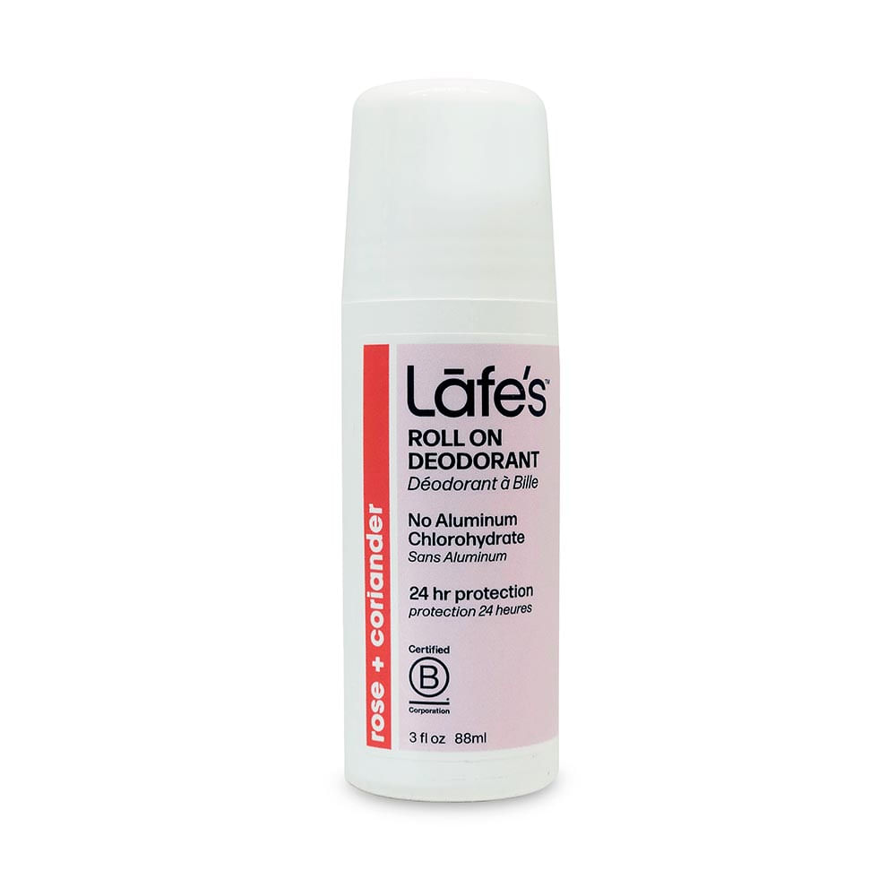 O Desodorante Roll-on Natural Rose e Coriander da Lafe's possui Aloe vera na sua composição, que amacia, hidrata e ajuda a manter a pele fresca e saudável o dia inteiro, o Óleo de Coriander (Óleo de Coentro), que reduz o suor, age contra o odor e inibe o aparecimento de fungos ajudando a curar infecções e o Witch hazel (Extrato de Hamamelis virginiana), que é um adstringente natural e antibactericida responsável por reduzir a oleosidade e sujeira da derme. Possui aroma fresco de rosas e íris que deixa a pele perfumada e renovada. Não obstrui os poros nem prejudica a saúde, por este e outros motivos os desodorantes naturais e orgânicosda Lafe’s foram homenageados em diversas premiações, como o prêmio de "Solução Natural de Beleza com Consciência" Natural Solutions nos Estados Unidos dois anos seguidos.