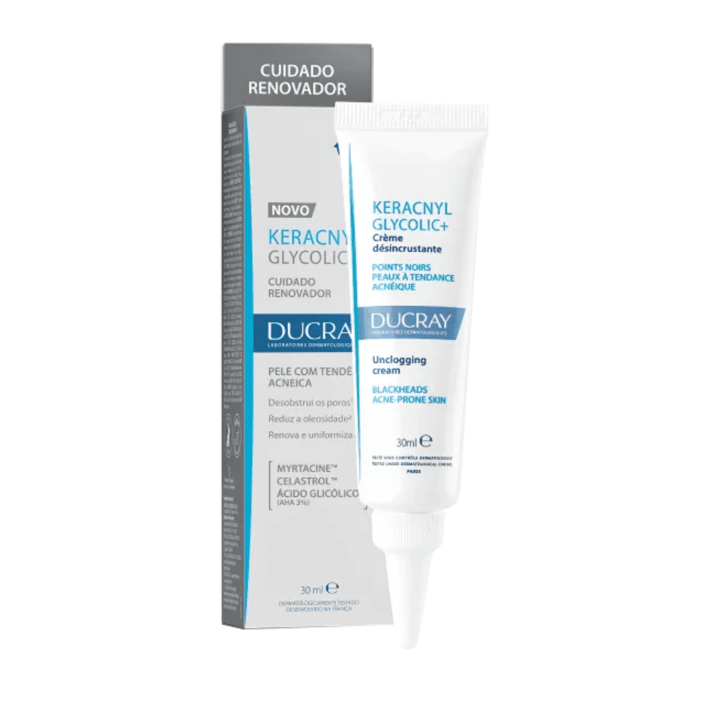 O Ducray Keracnyl Glycolic+ Tratamento Desincrustante 30ml é um dermocosmético desenvolvido para desobstruir os poros, eliminar células mortas e reduzir a formação de cravos e espinhas. Sua fórmula promove renovação celular, deixando a pele mais lisa, uniforme e saudável.