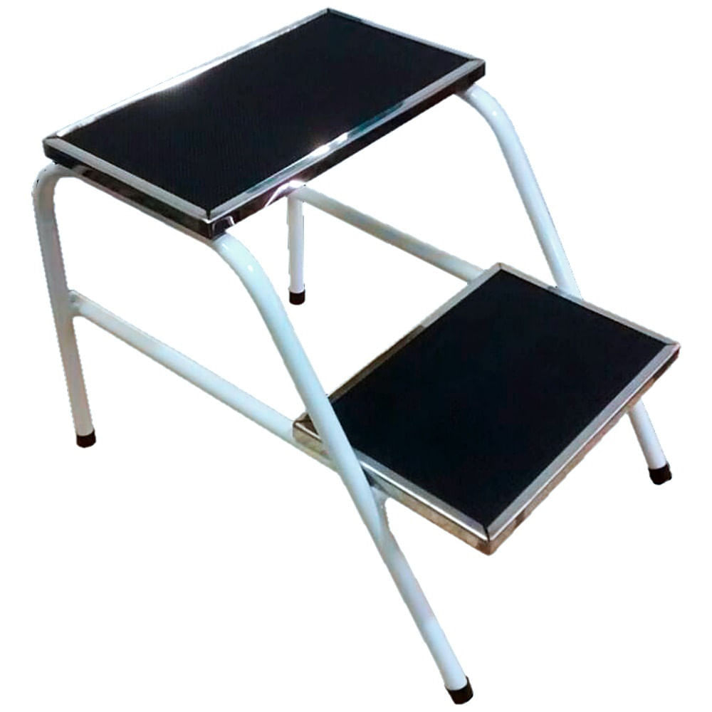 Escadinha de Dois Degraus - MAP Escada Auxiliar Dois Degraus é confeccionada em aço, com degraus confeccionados em madeira revestida em material termoplástico antiderrapante protegidos por cantoneiras de chapa de aço inoxidável em toda extensão