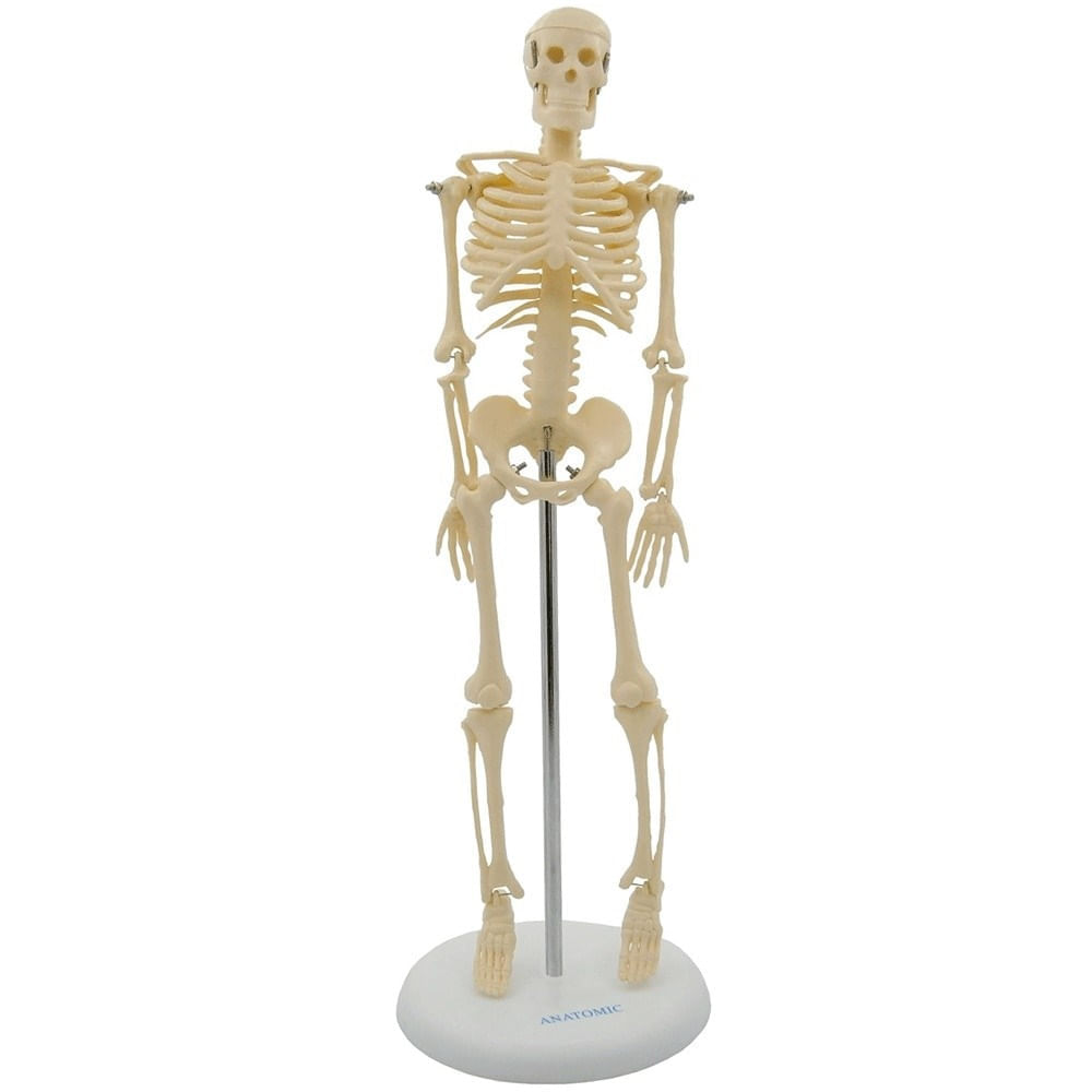 Esqueleto articulado com aproximadamente 85 cm de altura, confeccionado em resina plástica rígida de cor natural, ideal para estudo e demonstração anatômica.