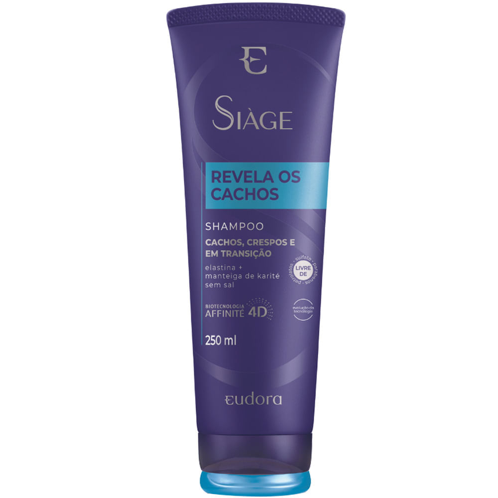 Cachos definidos, com balanço natural, e sem frizz.Siàge Revela os Cachos possui fórmula inteligente que reconhece os pontos de torção do fio, fornecendo tratamento ideal para todos os tipos de cacho. Fórmulas com Elastina, combinada à Manteiga de Karité, que garantem alta definição, força, elasticidade e 3X menos frizz. Cachos impecáveis, ultra hidratados e definidos até a última volta.Shampoo Siàge Revela Os Cachos possui fórmula hidratante que limpa suavemente os fios e mantém a maciez e aspecto natural do cabelo.Indicado:Cabelos com todos os tipos de cacho: ondulados, cacheados, crespos e em transição.Modo de uso: Aplique sobre os cabelos úmidos, massageando suavemente o couro cabeludo até formar espuma. Enxágue abundantemente e reaplique se necessário.