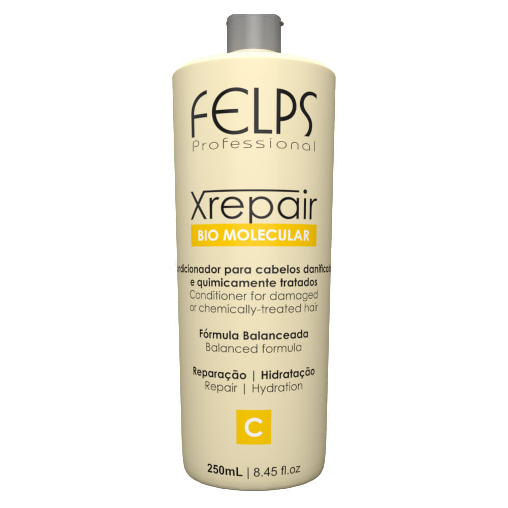 Condicionador para cabelos danificados e quimicamente tratados. Felps Profissional XRepair Bio Molecular Condicionador ajuda a hidratar e recuperar os fios dos procedimentos químicos para devolver o brilho e maciez.