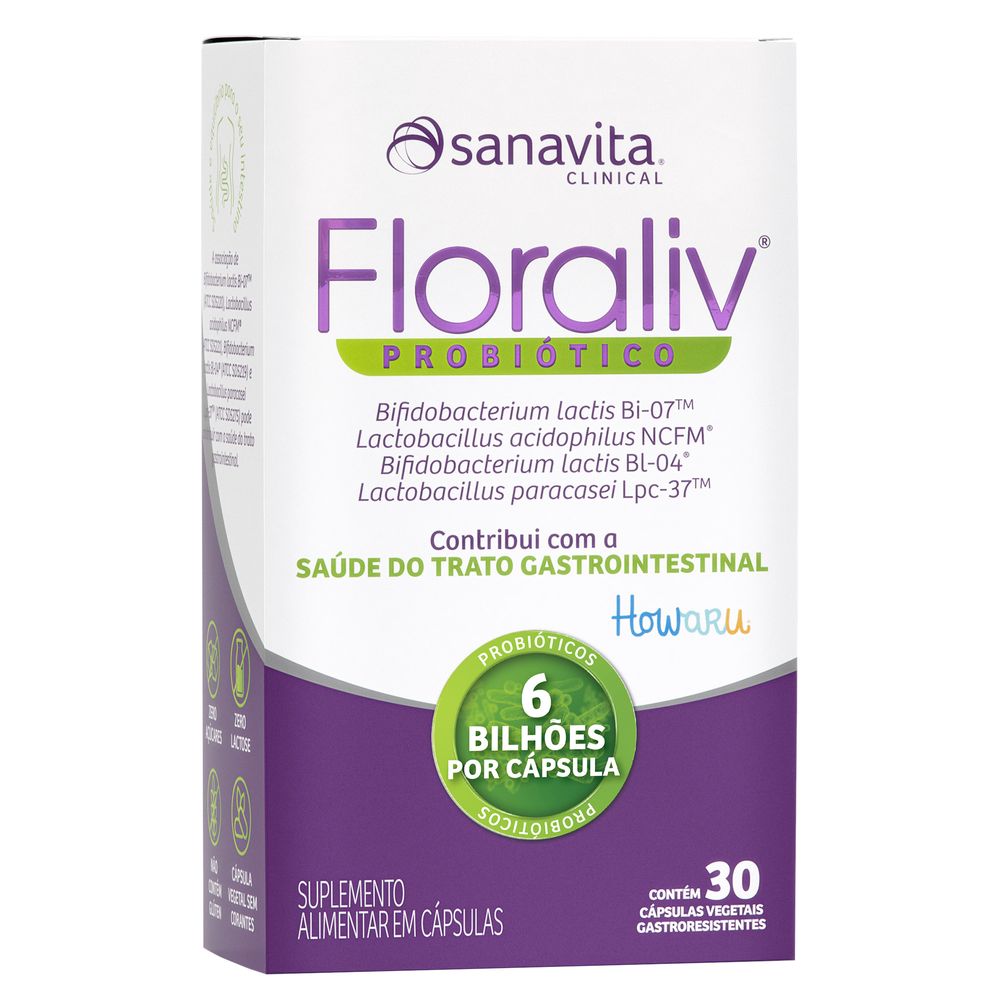 Floraliv® Probiótico é um suplemento composto por um mix de 4 probióticos (Lactobacillus acidophillus NCFM®, Lactobacillus paracasei Lpc-37TM, Bifidobacterium lactis Bi-07TM e Bifidobacterium lactis Bl-04®), combinados em alta concentração para te ajudar a manter uma flora intestinal saudável, contribuindo para a saúde gastrointestinal e outros benefícios para o seu corpo.
