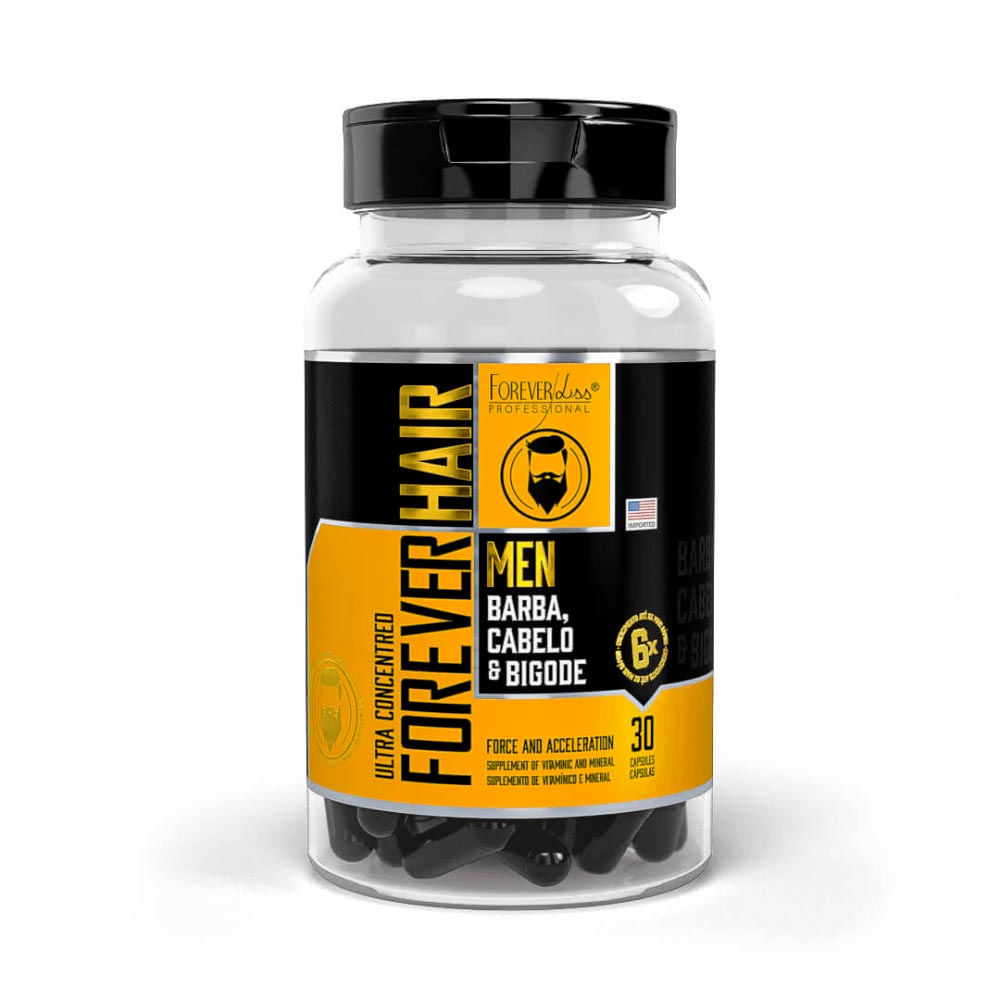 Suplemento nutricional especial para homens Forever Men Barba, Cabelo e Bigode Forever Liss 30 cápsulas sua composição é feita por vários ativos naturais importada dos EUA, ultra concentrados age de dentro para fora auxiliando na redução da queda capilar, crescimento acelerado em até 6x de forma saudável e fortalecimento da barba, cabelo e bigode.