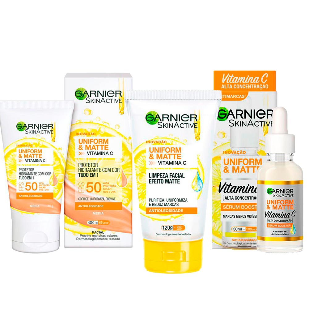 O Kit Contém:1 Sérum Facial Antimarcas Garnier Uniform & Matte Vitamina C - 30ml1 Gel de Limpeza Facial Garnier Uniform & Matte Vitamina C Antioleosidade - 120g1 Protetor Hidratante Facial Garnier Uniform & Matte Vitamina C FPS 50 Cor Média - 40gQuer um Efeito Peeling em casa e sem gastar muito?O novo Garnier Uniform & Matte Sérum Booster tem Alta Concentração de Vitamina C, Niacinamida, Ácido Salicílico e Extrato de Limão, que garantem marcas menos visíveis, pele uniformizada e hidratada, sem deixá-la oleosa. A textura sérum garante fácil aplicação, sensação gostosa pós uso e rápida absorção.Enriquecido com ingredientes naturais e Vitamina C, o novo Sabonete Limpeza Facial Uniform & Matte de Garnier limpa profundamente, removendo impurezas, oleosidade e maquiagem, sem agredir a pele. De textura leve e cremosa, ele limpa ao mesmo tempo que hidrata, reduz imperfeições e dura um tempão (360 usos).Em busca de um protetor hidratante TUDO EM 1, com alta eficácia dermatológica por um preço acessível? O novo Protetor Hidratante Uniform & Matte Vitamina C com cor foi feito para você!Tudo que você sempre sonhou em 1 só produto: corrige, reduz e previne manchas.