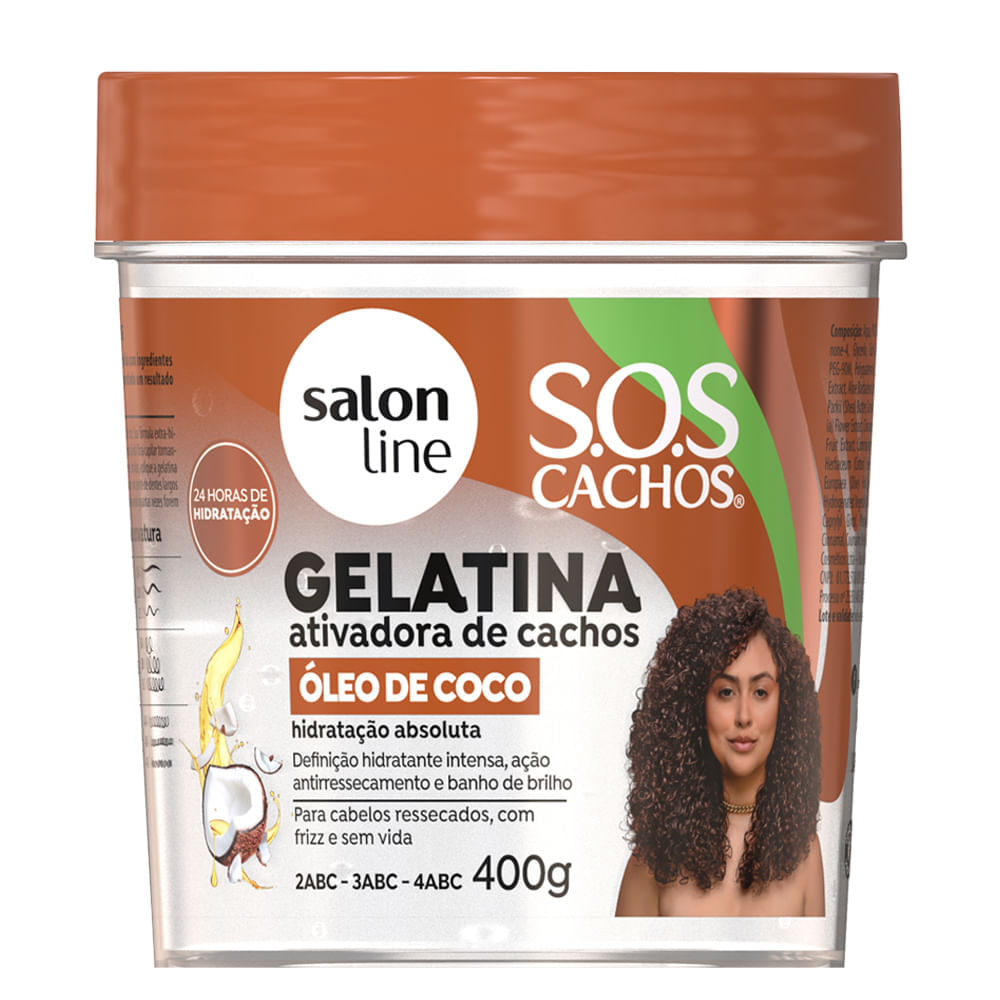 A Gelatina Salon Line SOS Cachos Óleo De Coco 400g é um produto que proporciona hidratação absoluta, definição intensa, combate o ressecamento, adiciona um banho de brilho e é ideal para cabelos ressecados, com frizz e sem vida das curvaturas 2ABC, 3ABC e 4ABC.