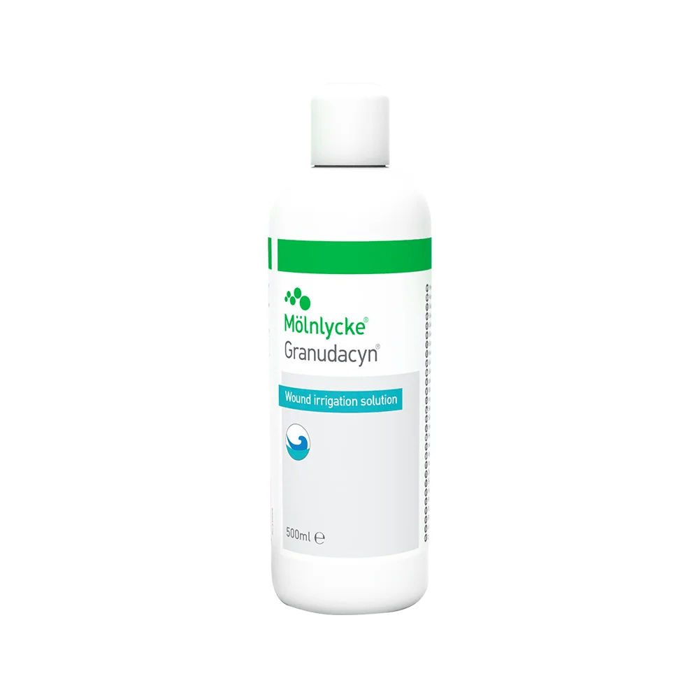 A Granudacyn 500ml, da Molnlycke, é uma solução estéril, isotônica e pronta para uso, desenvolvida com ácido hipocloroso (HOCl) para limpeza, irrigação e hidratação de feridas agudas, crônicas, cirúrgicas, cavitárias e queimaduras. Atua na redução de odores, no controle da carga microbiana e na preparação do leito da ferida para um processo de cicatrização mais eficaz.